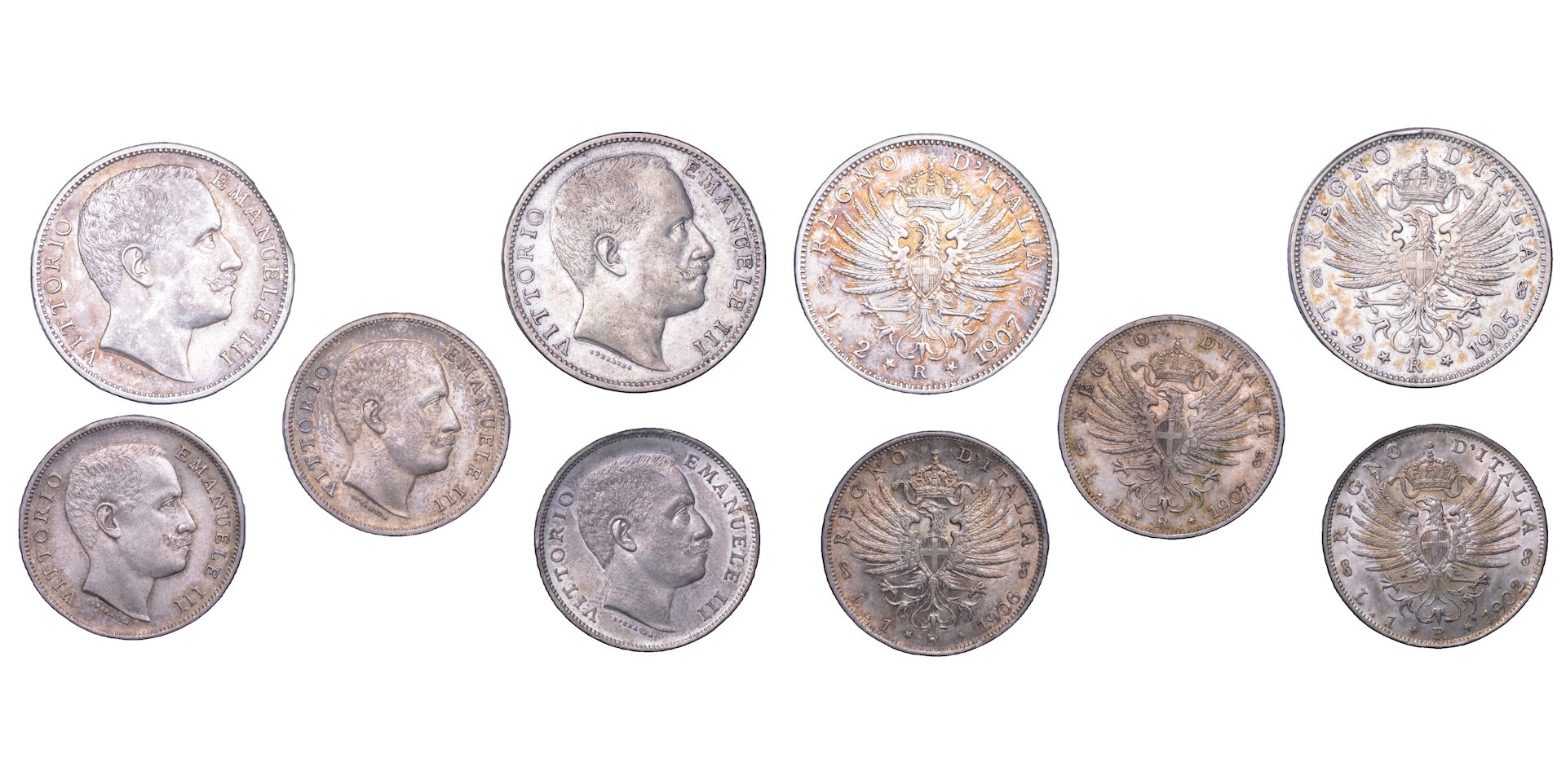 2 Lire 1905 - 2 Lire 1907 - Lira 1902 - Lira 1906 - Lira 1907. Gig. 93-95-128-130-131. esemplari in argento. Conservazioni da BB a SPL