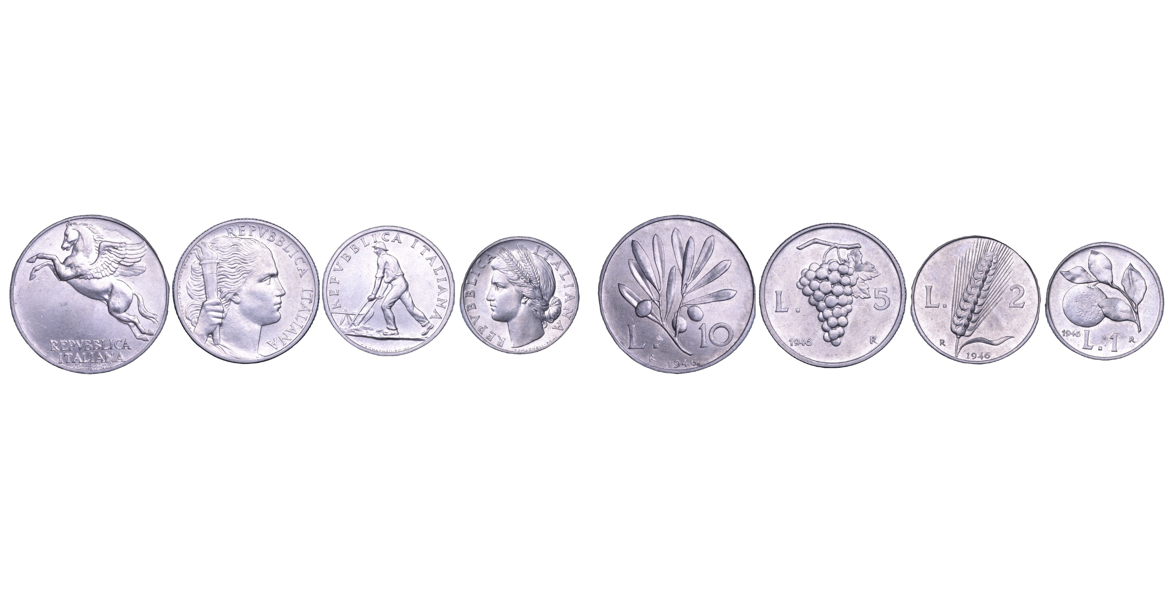 Serie completa anno 1946. 10 Lire (rara, segnetti Migliore di SPL) - 5 Lire (molto rara, lievi graffi, q.SPL) - 2 Lire (rara, SPL/q.FDC) - 1 Lira (rara, q.FDC). Gig. 229-277-324-361. Esemplari in italma.