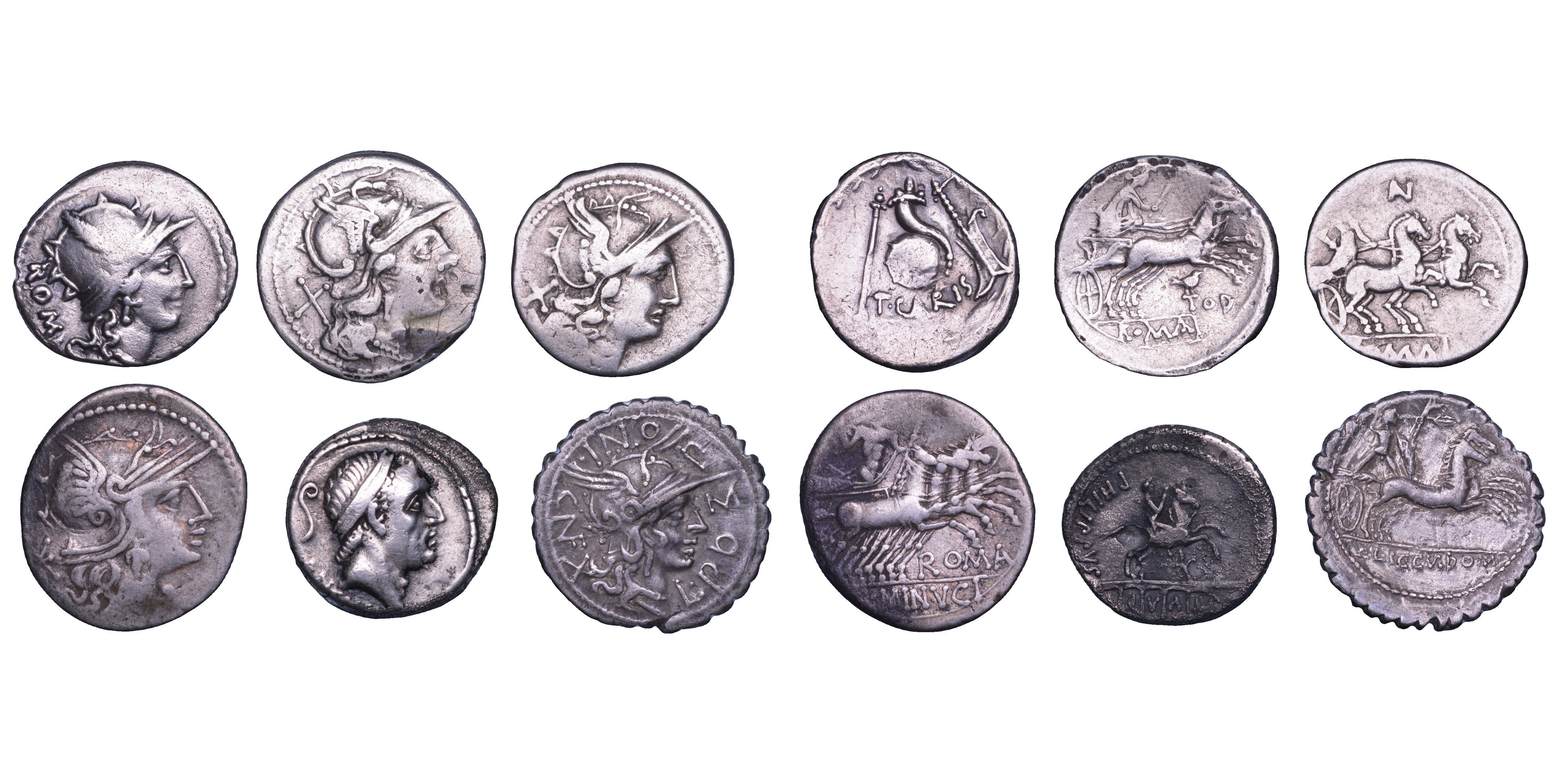 Esemplari di denari del III, II e I secolo a.C. coniati dalle gentes Aurelia, Carisia, Marcia, Minucia e Pomponia. Si segnala inoltre un esemplare anonimo. Argento. Conservazioni mediamente MB/BB.