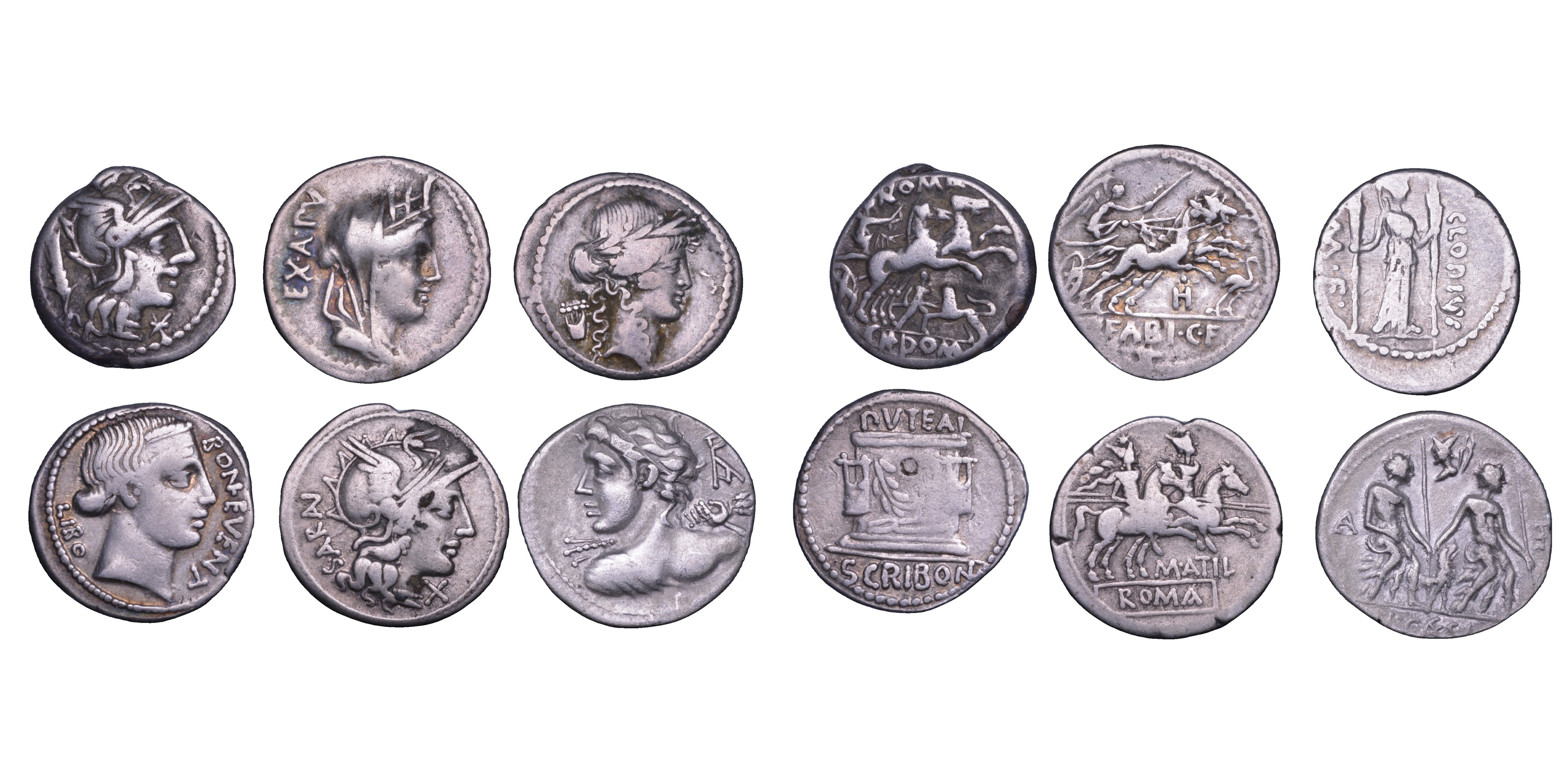 Esemplari di denari del II e I secolo a.C. coniati dalle gentes Atilia, Caesia, Clodia, Domitia, Fabia e Scribonia. Argento. Conservazioni mediamente MB/BB.