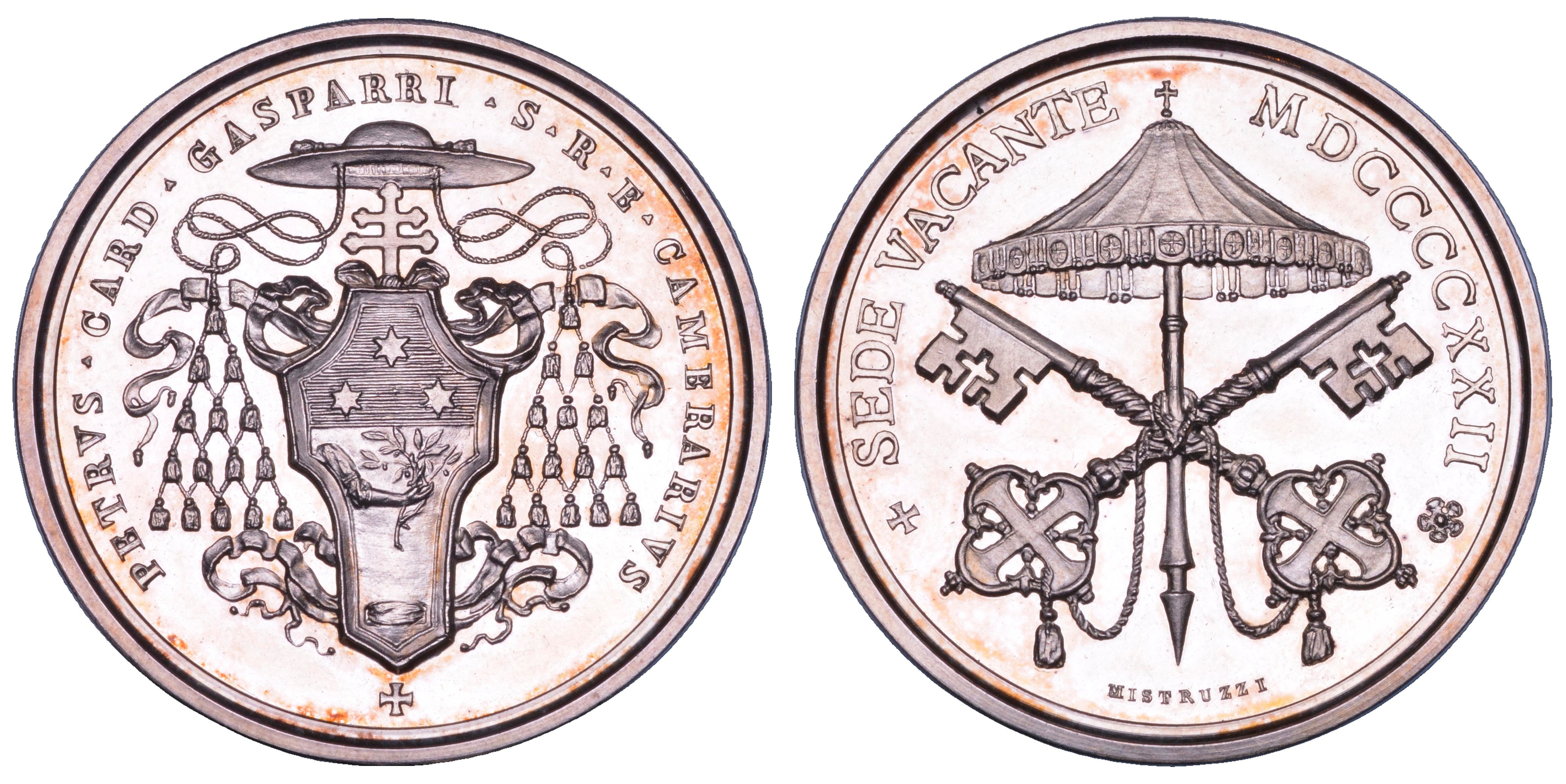 Stemma del Cardinale Camerlengo Pietro Gasparri sovrapposto alla Croce di Malta. R/ SEDE VACANTE MDCCCCXXII Padiglione con chiavi decussate. Opus A. Mistruzzi. Boccia 114. Bartolotti p. 348. Patrignani 161. Rara. g. 24,48. Diam. mm. 39,01. Arg. q.FDC