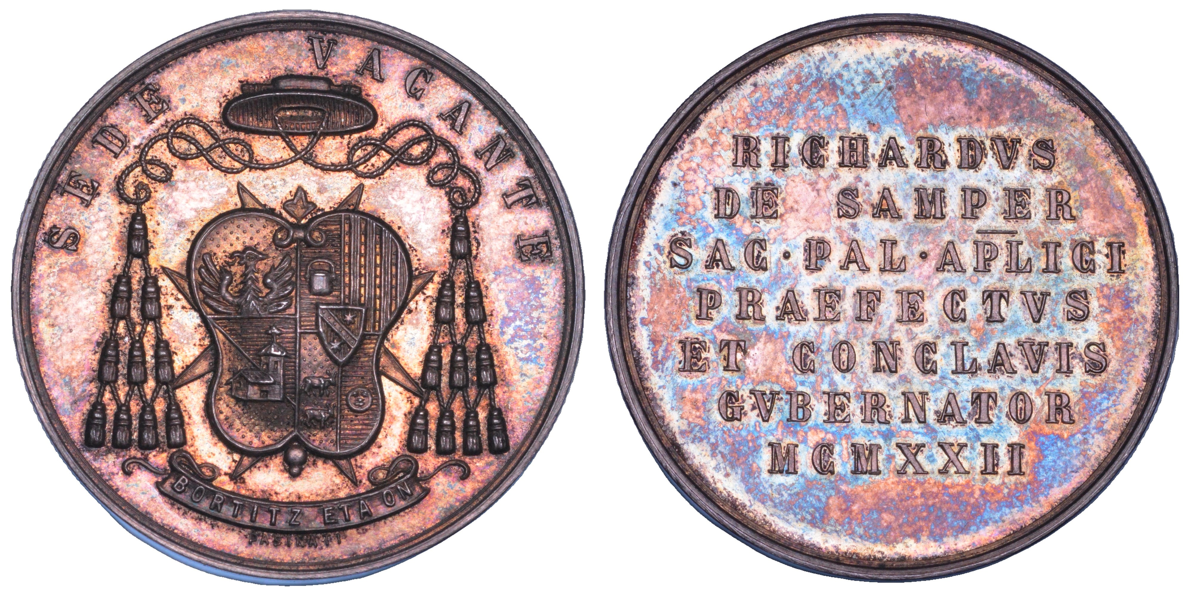 Stemma del Monsignore Riccardo De Samper con ai lati due chiavi verticali ed avvolto da un manto. In basso su nastro, la scritta in rilievo BORTITZ ETA ON. R/ RICHARDVS DE SAMPER SAC PAL APLICI PRAEFECTVS ET CONCLAVIS GVBERNATOR MCMXXII su sette righe. Opus bottega Pasinati. Boccia 115. Bartolotti p. 348. Patrignani 162. Estremamente rara. g. 11,03. Diam. mm. 29,06. Arg. Bella patina iridescente. q.FDC