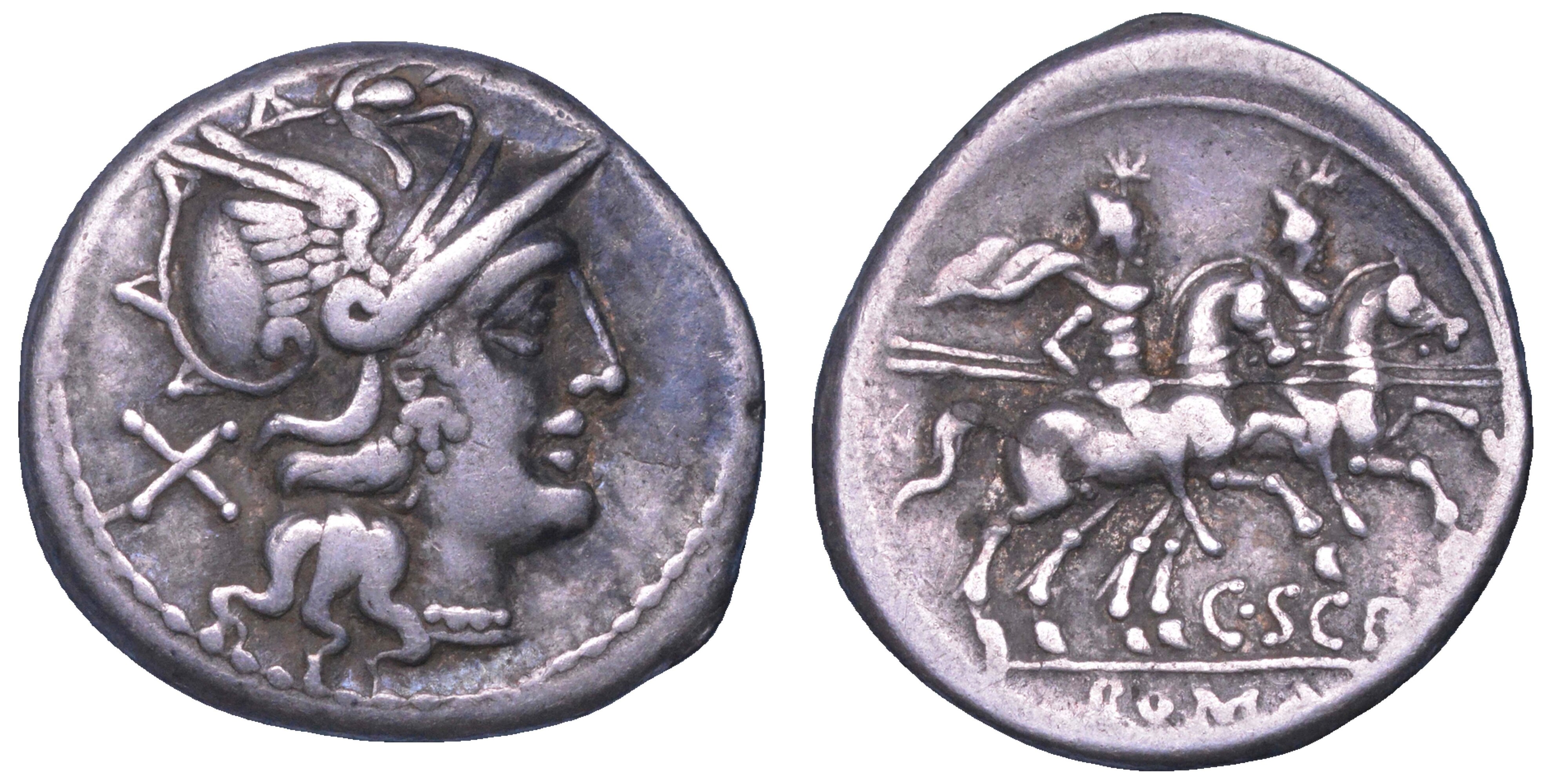 SCRIBONIA. C. Scribonius Curio, 154 a.C. Denario.