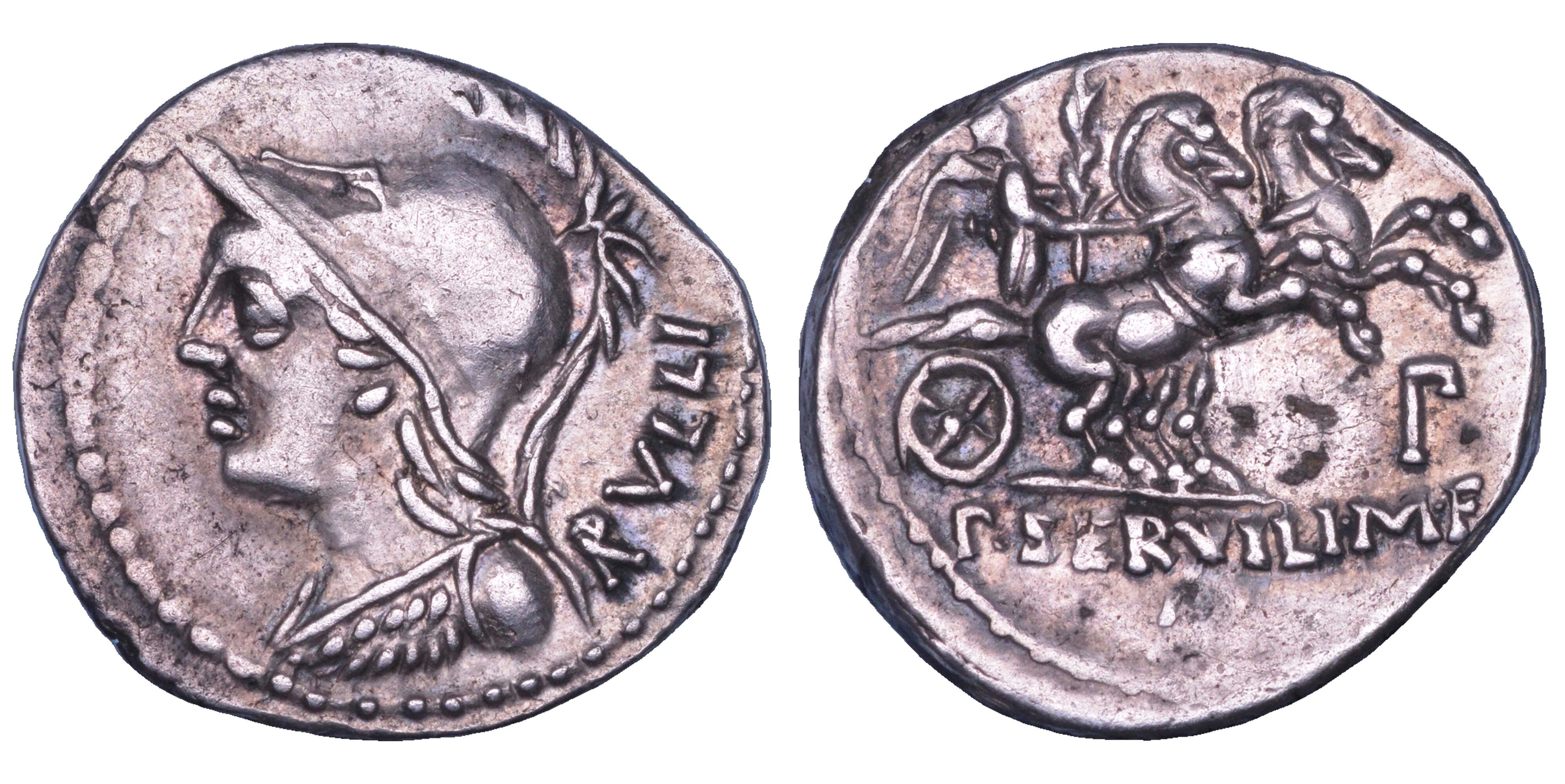 SERVILIA. P. Servilius M.f. Rullus, 100 a.C. Denario.
