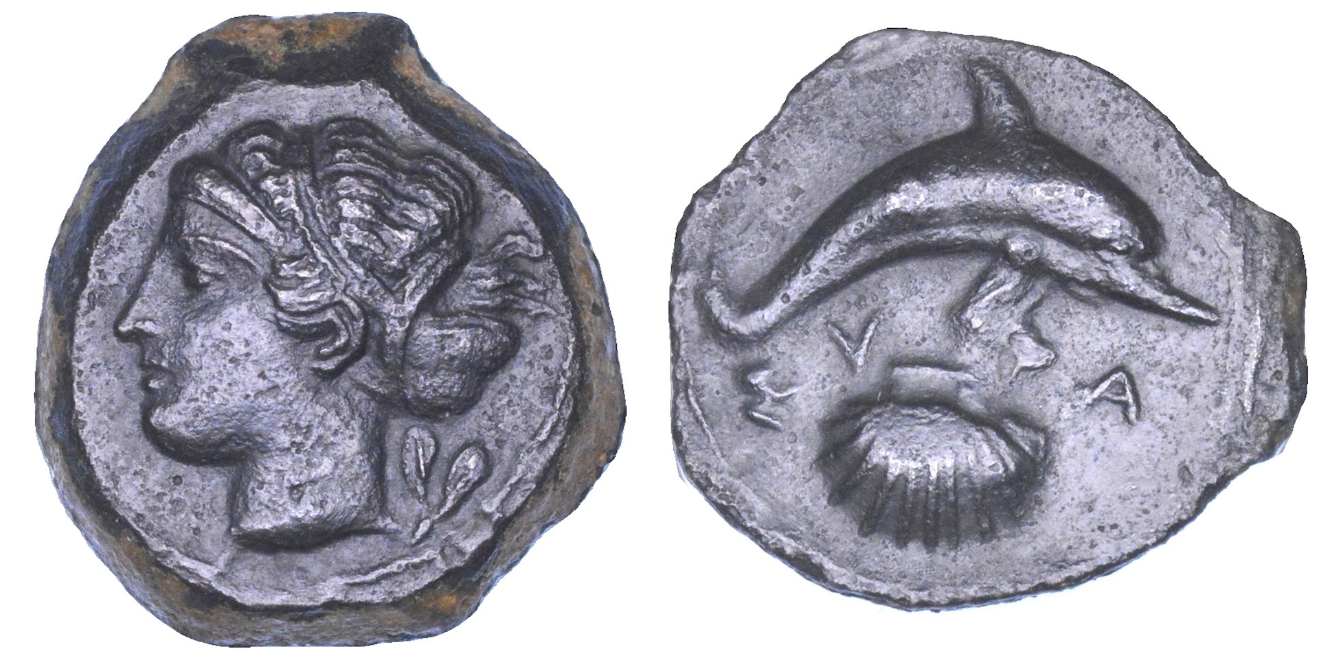 Testa di Arethusa a s.; dietro, due foglie. R/ Delfino verso d.; sotto, scritta SYPA e conchiglia. Calciati II 24. g. 3,88. Diam. mm. 16,88. Bronzo. q.SPL