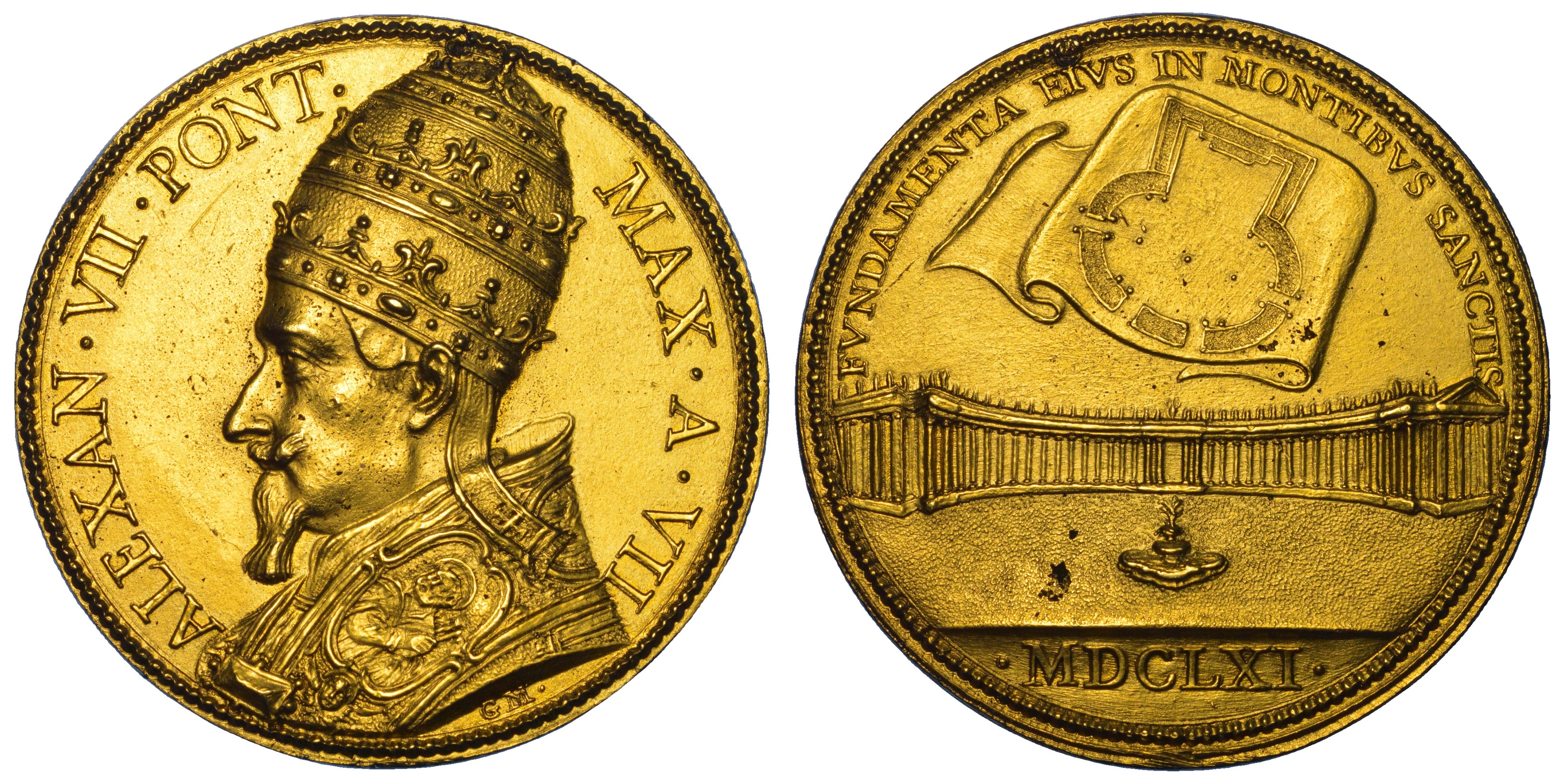 STATO PONTIFICIO. ALESSANDRO VII (Fabio Chigi), 1655-1667. Medaglia annuale in bronzo dorato 1661/A. VII. Costruzione del colonnato di Piazza San Pietro.