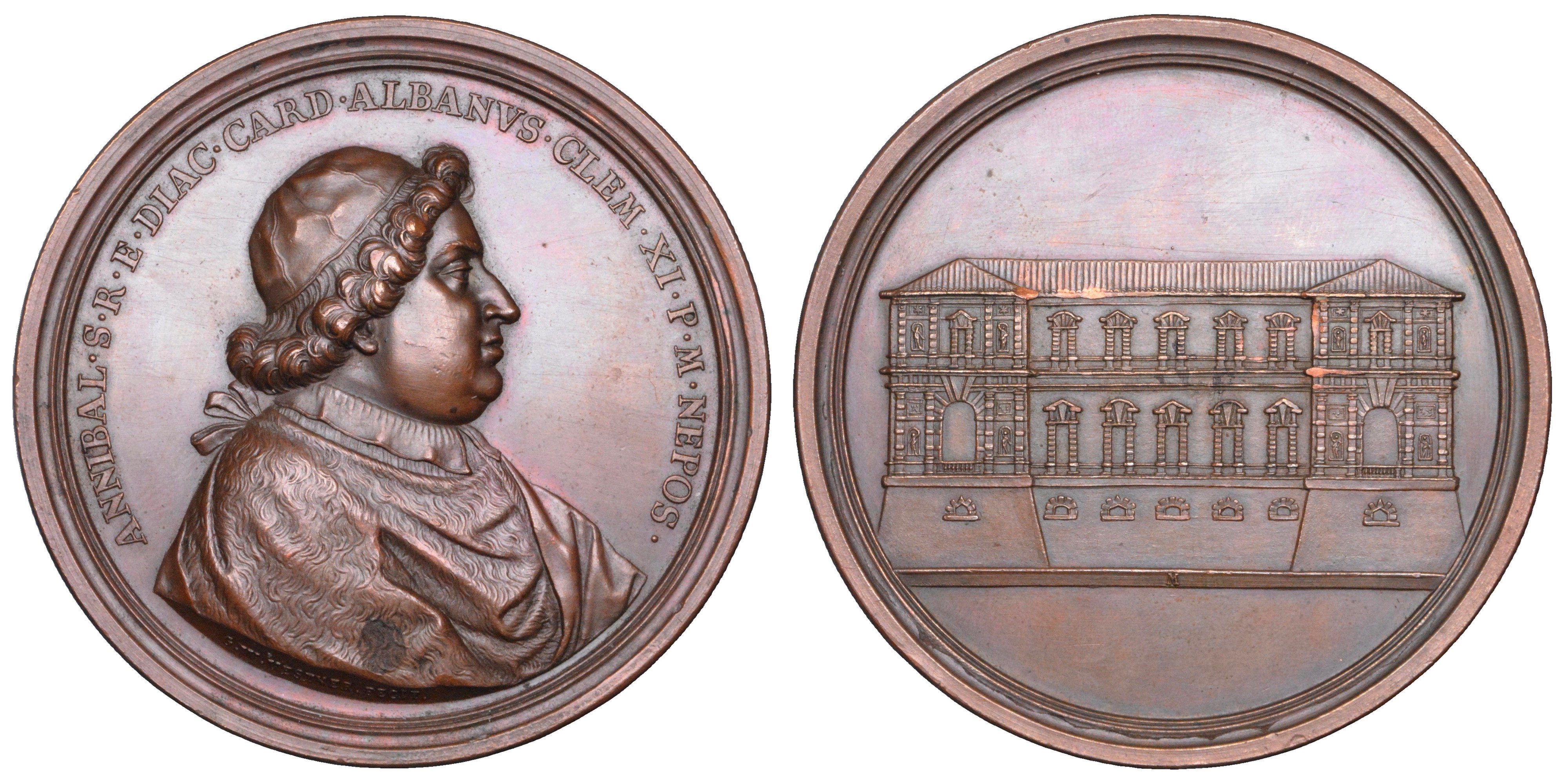 ANNIBAL S R E DIAC CARD ALBANVS CLEM XI P M NEPOS Busto a d., con camauro e mantella. R/ Anepigrafe. Veduta prospettica di Villa Albani. Opus George Wilhelm Vestner. Miselli, 140. Molto rara. g. 178,96. Diam. mm. 72,96. Bronzo. SPL