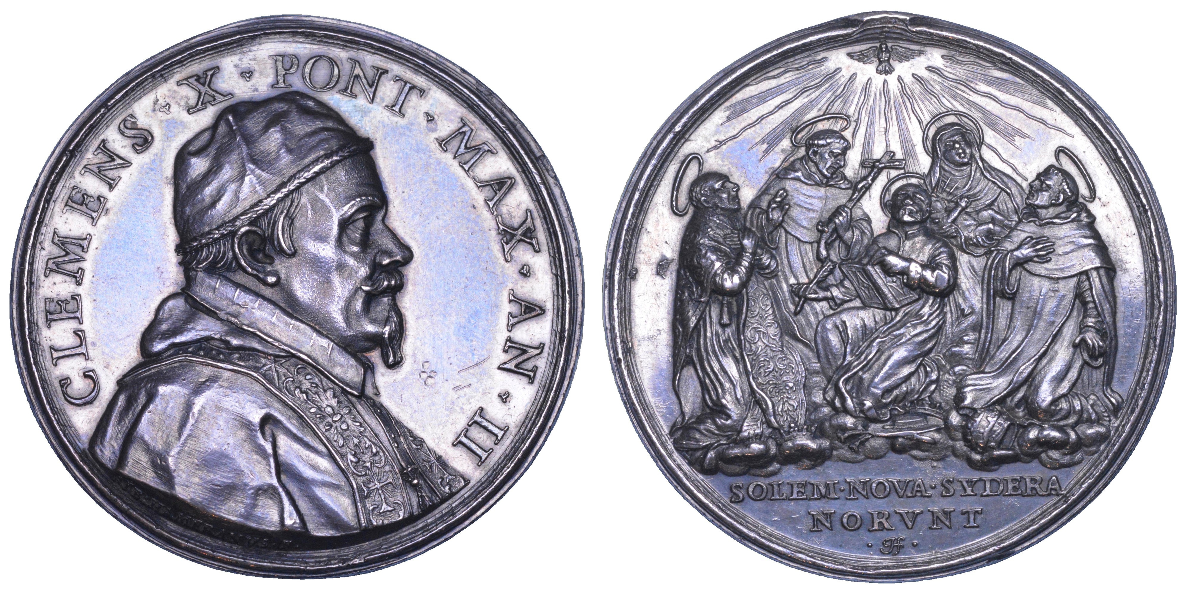 CLEMENS X PONT MAX AN II. Busto di Clemente X a d., con camauro e mozzetta. R/ SOLEM NOVAE SYDERA NORVNT I cinque Santi sotto lo Spirito Santo come colomba. Opus Alberto Hamerani. Miselli 21. Patrignani II/5. g. 33,47. Diam. mm. 41,08. Arg. Patina scura. Traccia di appiccagnolo. q.SPL