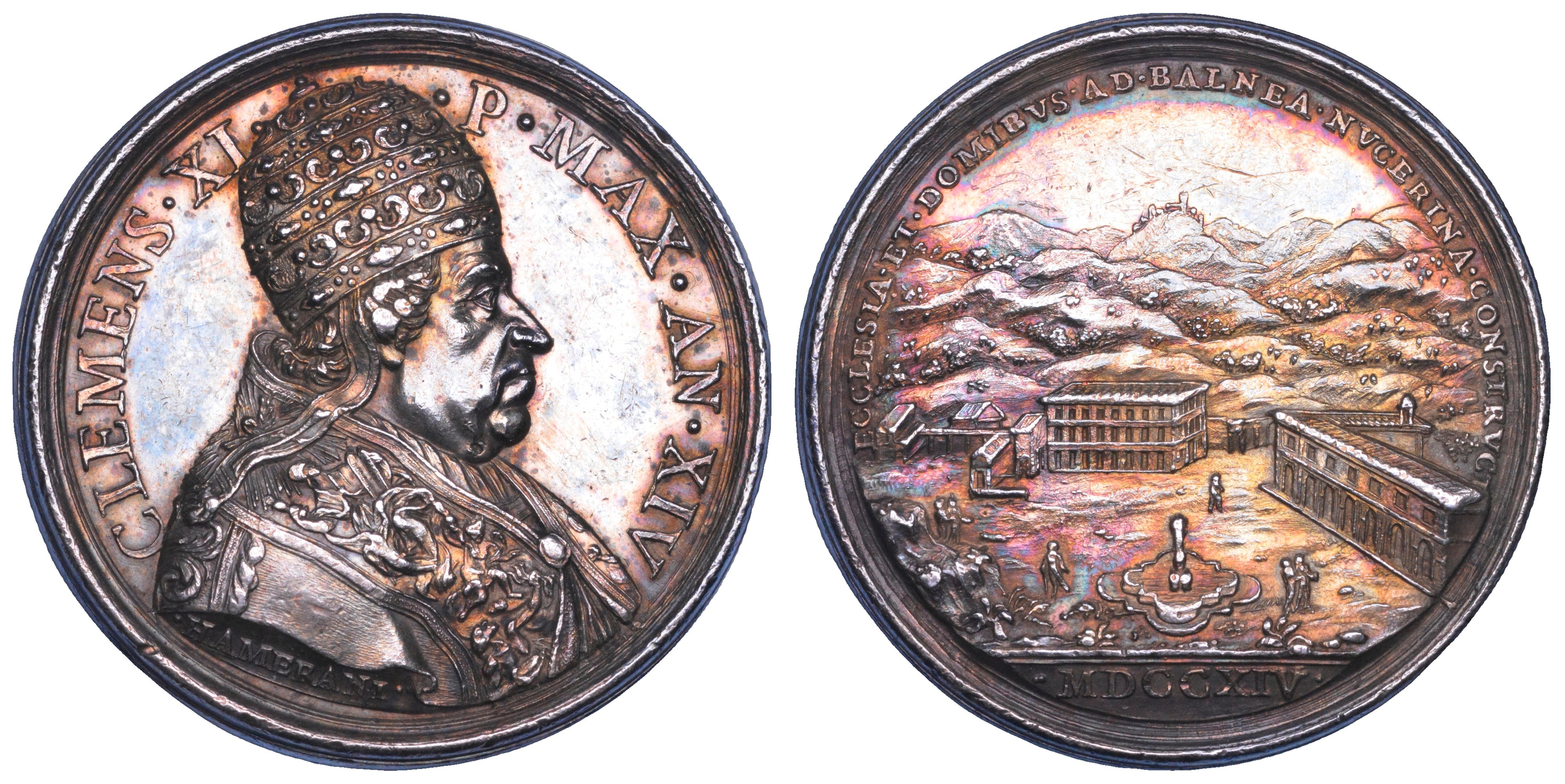 CLEMENS XI P MAX AN XIV Busto del Pontefice a d. con triregno e piviale su cui rappresentazione della Chiesa che calpesta l'Eresia. R/ ECCLESIA ET DOMIBVS AD BALNEA NVCERINA CONSTRVCT Veduta prospettica delle nuove costruzioni dei bagni di Nocera in esergo, MDCCXIV. Opus Ermenegildo Hamerani. Bart. E714. Modesti 192. Miselli 96. g. 28,32. Diam. mm. 39,26. Molto rara. Arg. Patina scura di medagliere. Buon BB