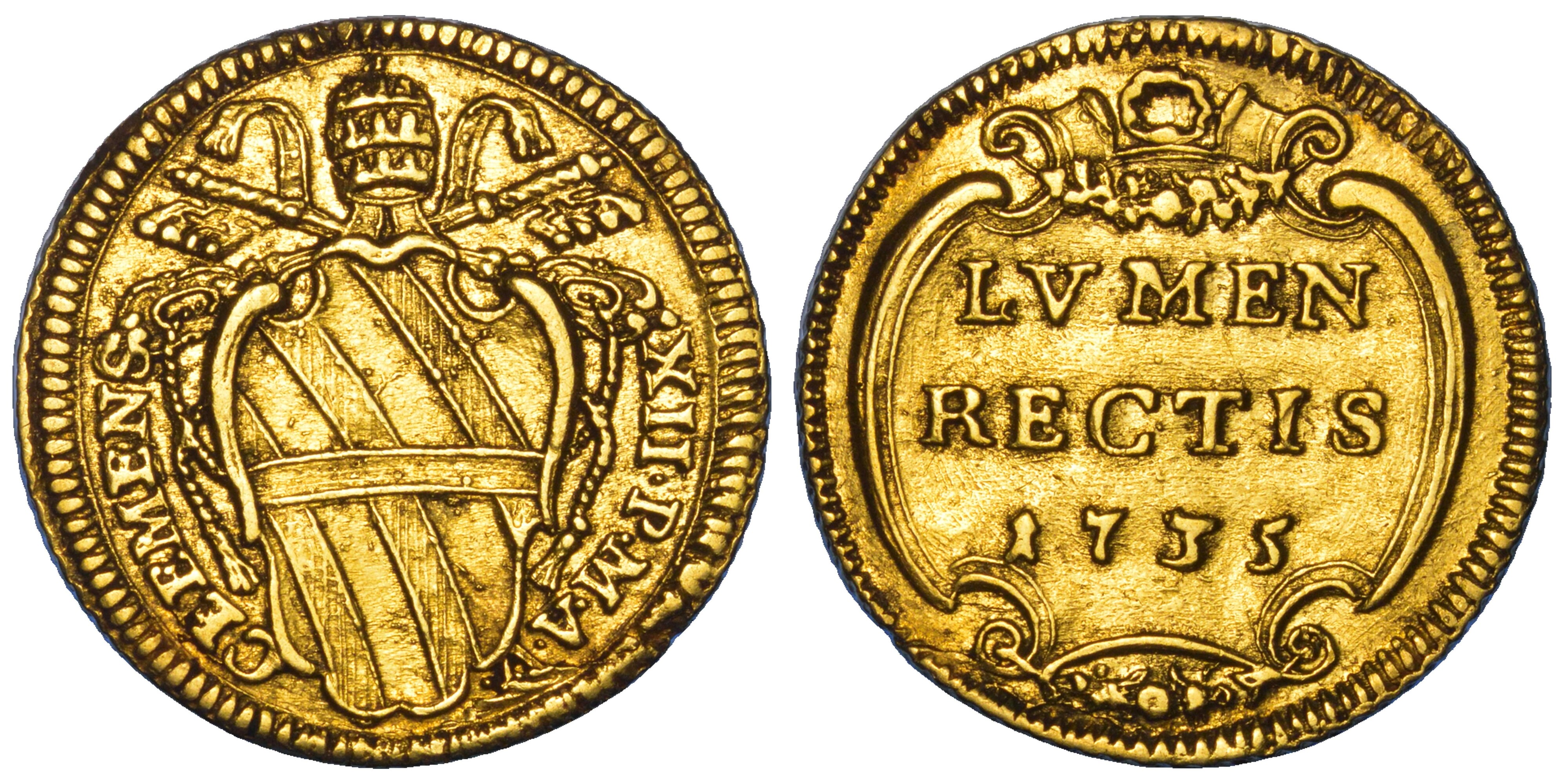 CLEMENS XI P M A V Stemma papale sormontato da chiavi decussate e triregno. R/ LVMEN RECTIS 1735 in tre righe entro cartella ornata a volute. Munt. 14. MIR 2488/2. Fr. 224. Raro. g. 3,02. Diam. mm. 19,17. Oro. Debolezze di conio. BB
