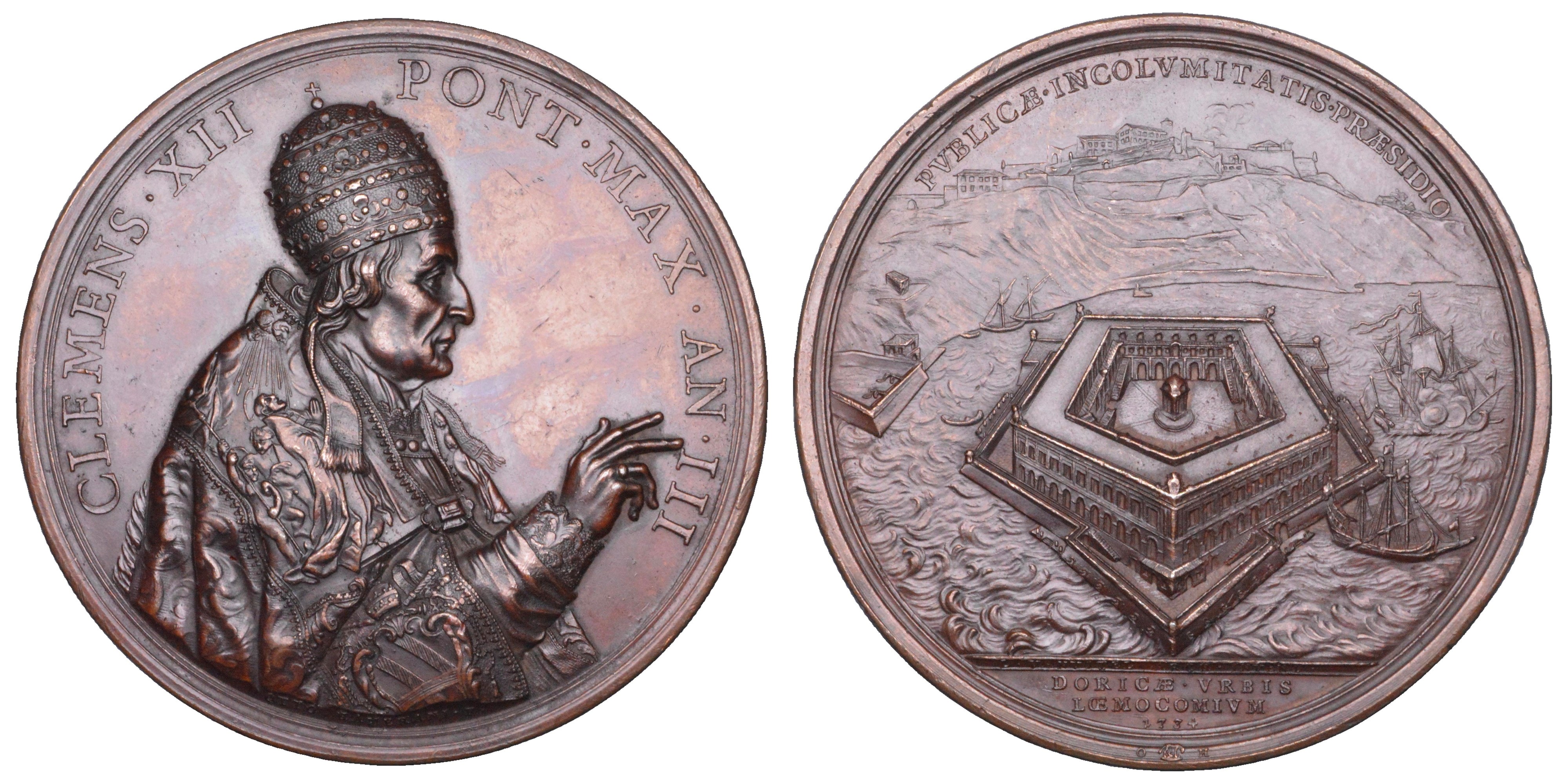 CLEMENS XII PONT MAX AN III Busto a d. con mano alzata in atto benedicente con triregno e piviale riccamente ornato. R/ PVBLICAE INCOLVMITATIS PRAESIDIO Veduta della città di Ancona sullo sfondo con il porto in primo piano, navi e il lazzaretto; all’esergo, DORICAE VRBIS LOEMOCOMIVM 1734. Sulla linea dell’esergo, L VANVINTEL ARCH INVEN. Sul giro esterno, in piccolo, O - Lupa - H. Opus O. Hamerani. Patrignani, 20. Lincoln 1781. Forrer p. 405. g. 136,74. Diam. mm. 71,56. Bronzo. SPL