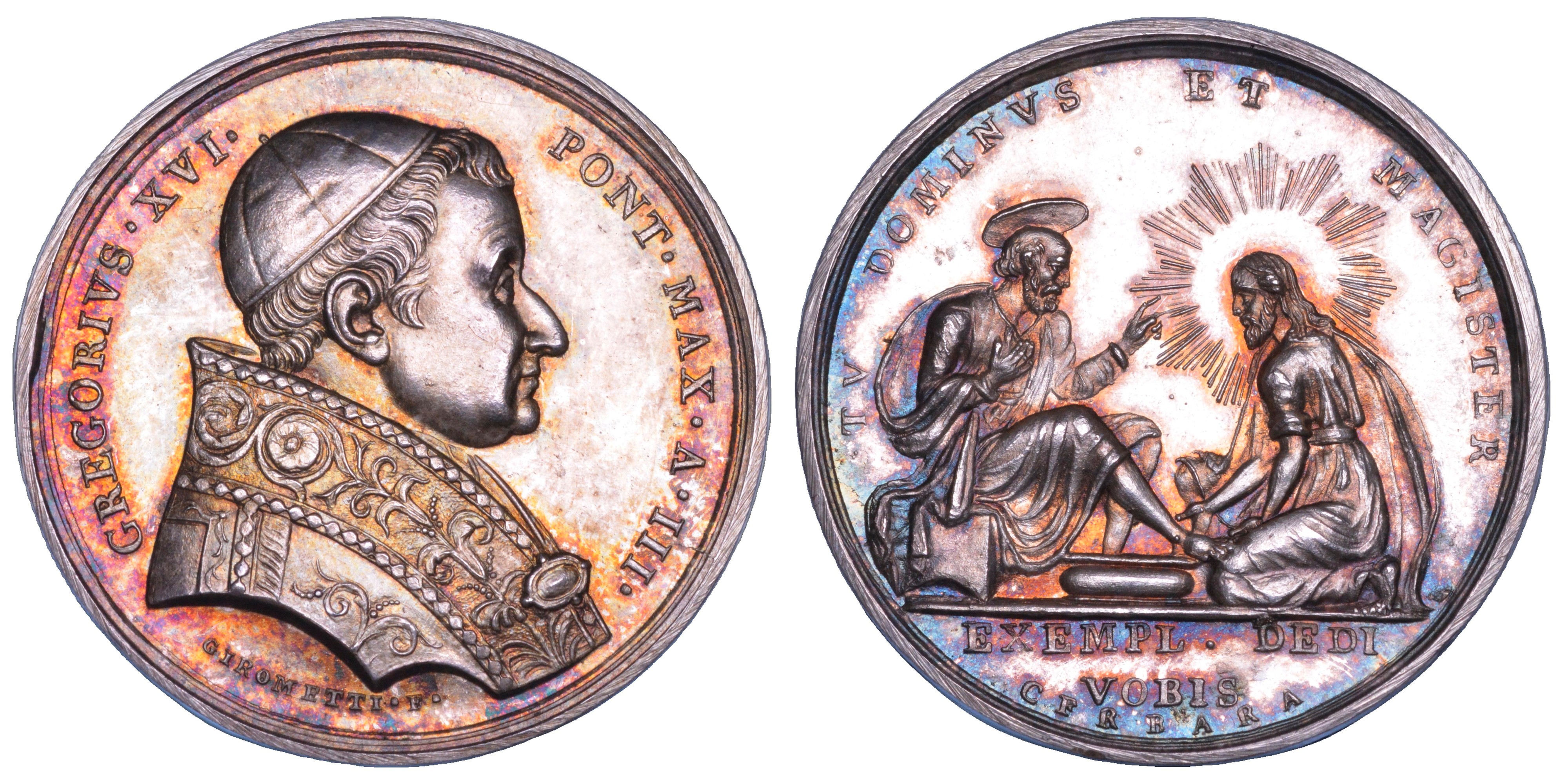GREGORIVS XVI PONT MAX A III Busto del Pontefice a d. con zucchetto e piviale ornato. R/ TV DOMINVS ET MAGISTER Gesù radiato lava i piedi a S. Pietro in esergo, EXEMPL DEDI VOBIS. Opus Giuseppe Girometti. Boccia, 42 (prima variante). Molto rara. g. 15,26. Diam. mm. 32,57. Arg. q.FDC