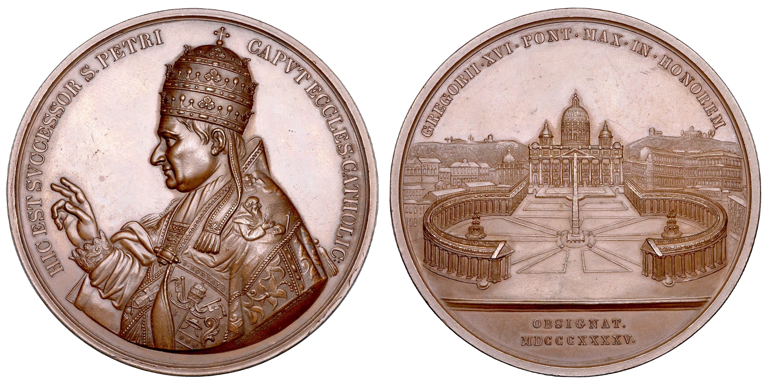 HIC EST SVCCESSOR S PETRI CAPVT EC CLES CATHOLIC Busto del Pontefice benedicente a s. con triregno e piviale decorato con la figura di S. Romualdo e lo stemma Cappellari. R/ GREGORII XVI PONT MAX IN HONOREM Piazza San Pietro con la Basilica ed il Porticato; in esergo OBSIGNAT MDCCCXXXXV.Opus Karl Radnitzky. Boccia 199. Patrignani 104. g. 168,40. Diam. mm. 72,85. Bronzo. SPL