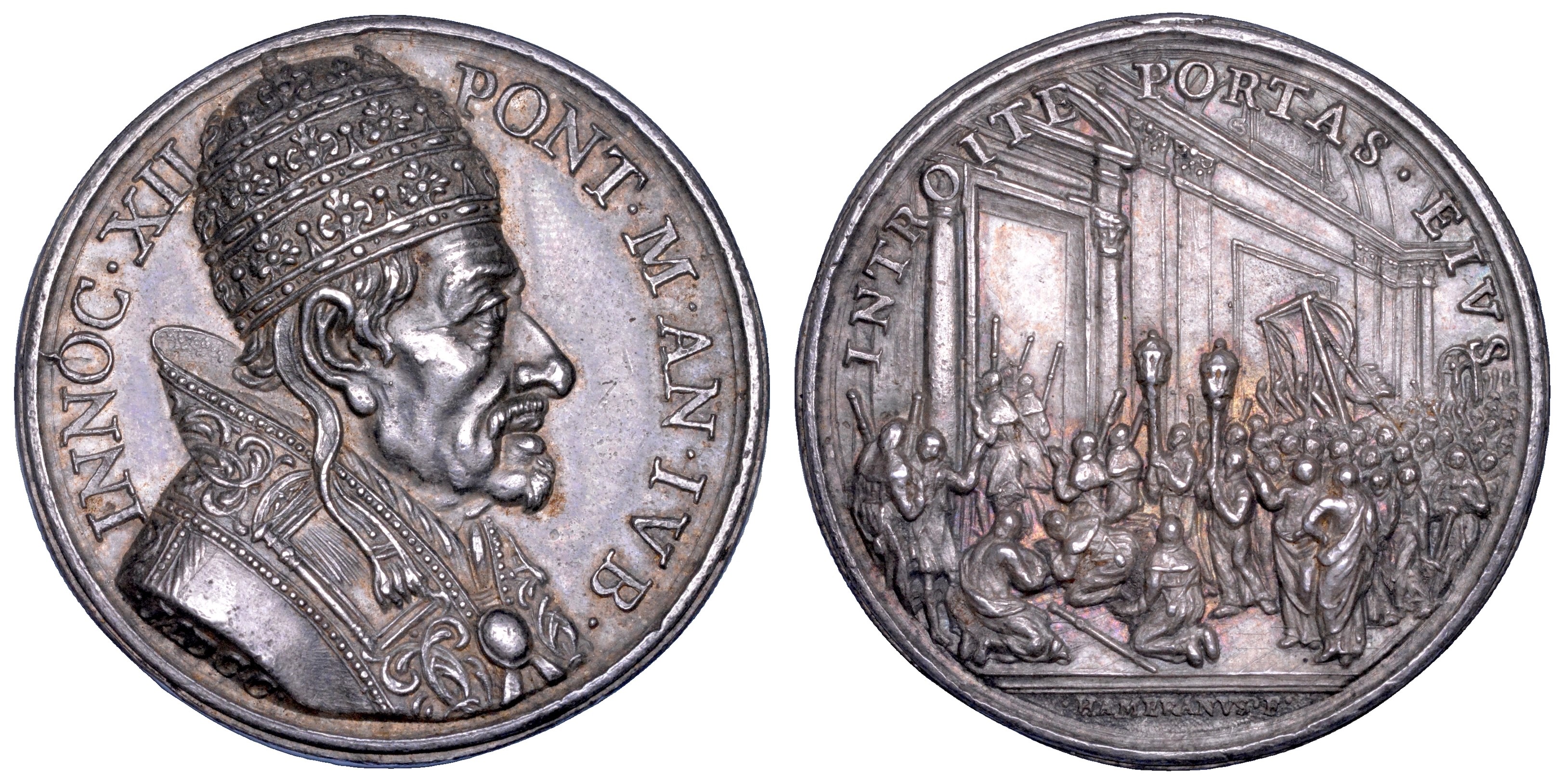 INNOC XII PONT M AN IVB Busto del Pontefice a d. con tiara e piviale su cui Porta Santa; sul taglio della spalla, MDCC. R/ INTROITE PORTAS EIVS Una processione entra attraverso la Porta Santa nella Basilica Vaticana. Opus Giovanni Hamerani. Bart. E700. Modesti 177. Miselli 349. g. 24,03. Molto rara. Diam. mm. 37,18. Arg. buon BB