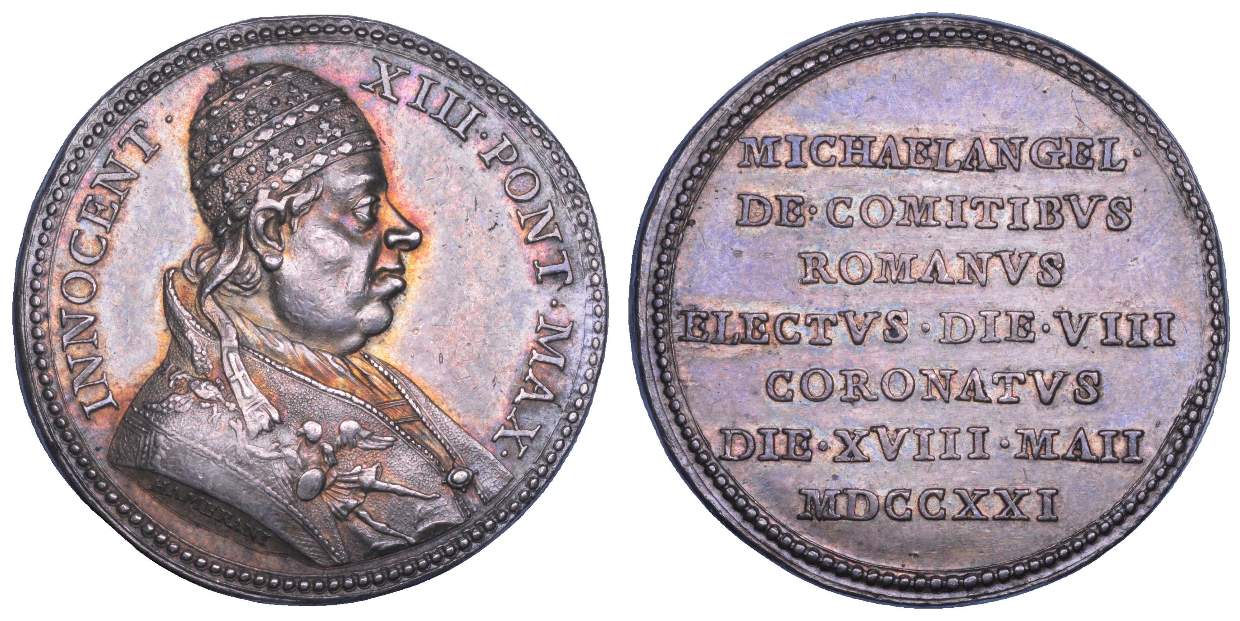 INNOCENT XIII PONT MAX. Busto a d. con triregno a e piviale decorato con l'arcangelo Michele. R/ MICHAELANGEL DE COMITIBVS ROMANVS ELECTVS DIE VIII CORONATVS DIE XVIII MAII MDCCXXI. Iscrizione disposta su sette righe. Opus E. Hamerani. Miselli 154. Rara. g. 13,57. Diam. mm. 31,82. Arg. BB//SPL