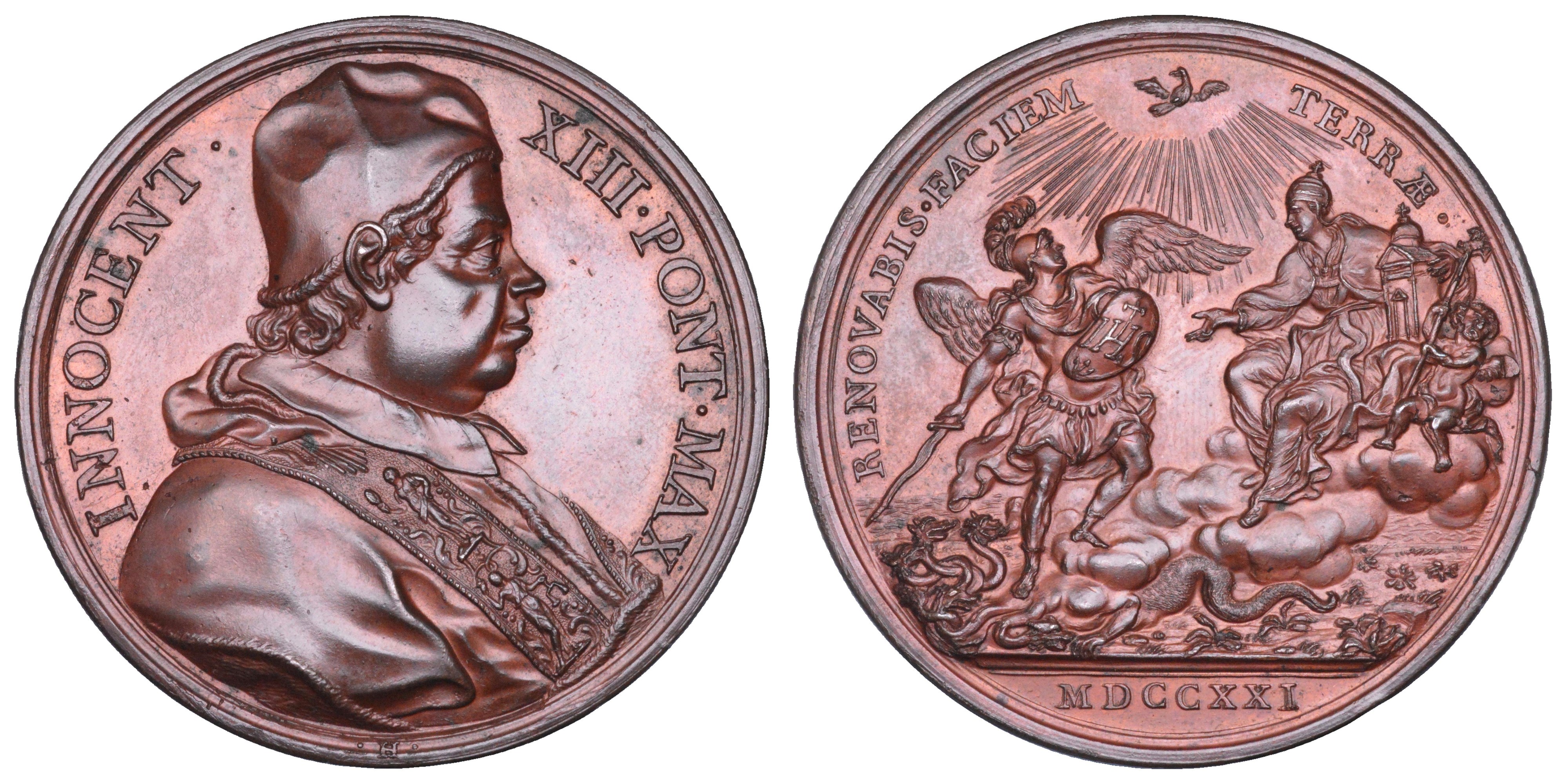 INNOCENT XIII PONT MAX Busto del Pontefice a d. con camauro, mozzetta e stola ornata. R/ RENOVABIS FACIEM TERRAE S. Michele Arcangelo, rivolto verso la Chiesa seduta con tempietto, sconfigge il demonio raffigurato dall'idra dalle sette teste il tutto irradiato dalla colomba dello Spirito Santo in esergo, MDCCXXI. Opus Ermenegildo Hamerani. Miselli 160. Ampach 6286. Börner 1312. g. 54,10. Diam. mm. 48,74. Bronzo. SPL/q.FDC