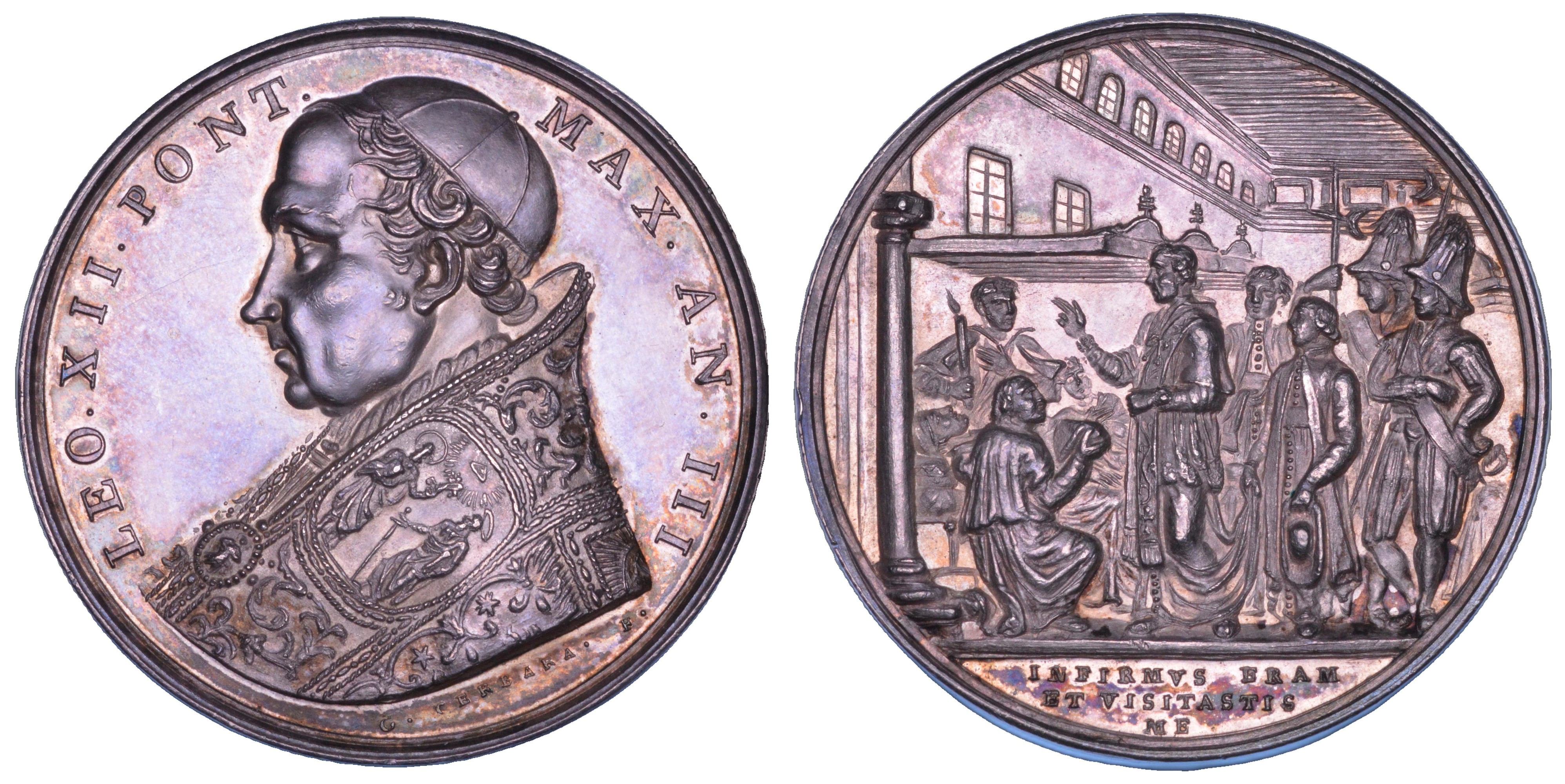 LEO XII PONT MAX AN III Busto del Pontefice a s., con berretto e piviale. R/ INFIRMVS ERAM ET VISITASTIS ME Il Pontefice accompagnato dal seguito visita gli infermi nell'Ospedale di Santo Spirito. Opus G. Cerbara. Modesti 294. Bart. E826. Rara. g. 32,08. Diam. mm. 42,54. Arg. Impercettibili graffi. SPL/FDC