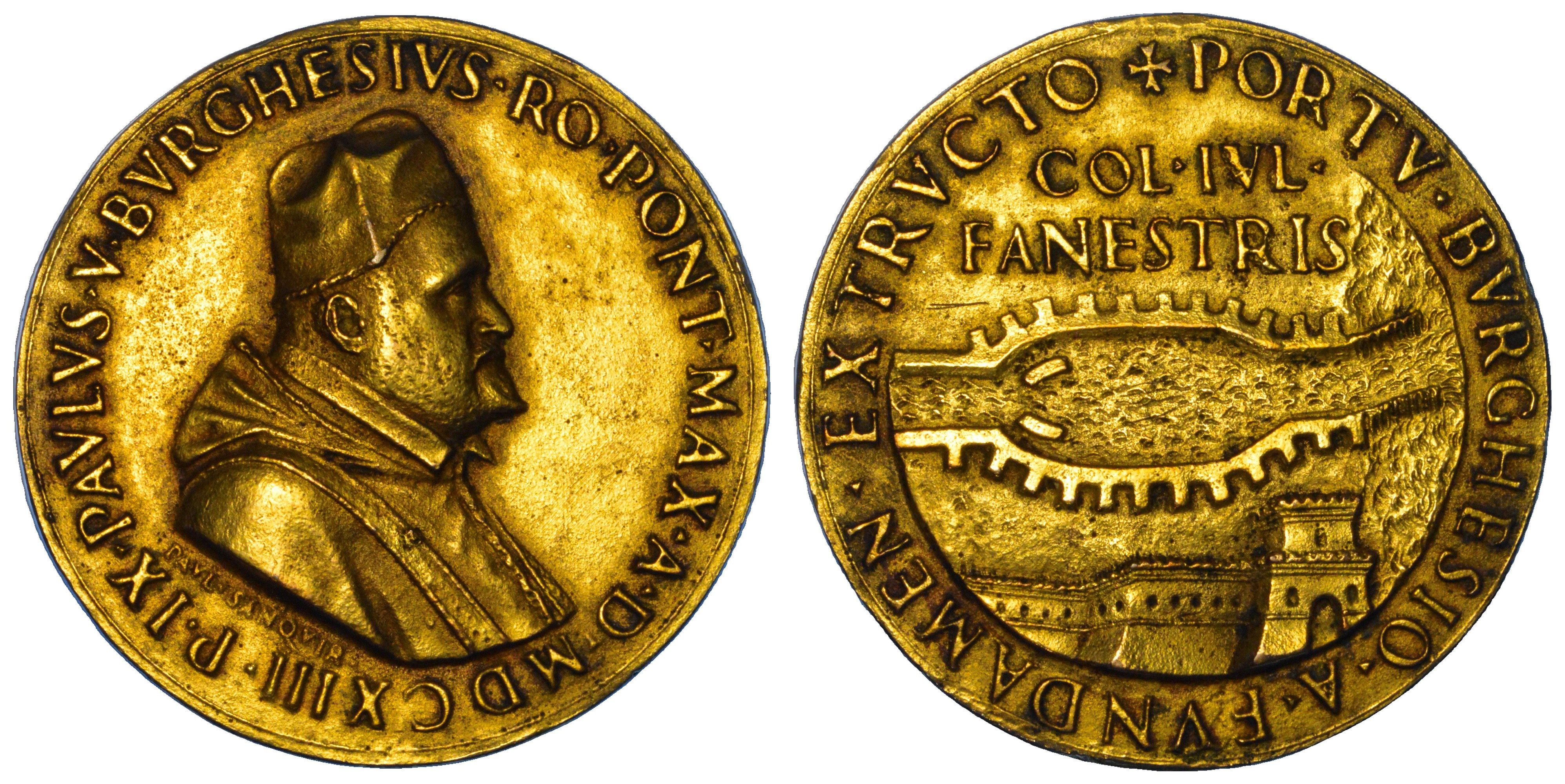 PAVLVS V BVRGHESIVS RO PONT MAX A D M DC XIII P IX Busto a d. con camauro e mozzetta. R/ PORTV BVRGHESIO A FVNDAMEN EXTRVCTO Prospetto del porto di Fano secondo il progetto di G. Rainaldi in basso, tratto di mura e bastioni della città in alto, nel campo, COL IVL FANESTRIS.Opus Paolo Sanquirico. CNORP IV, 1072. Vannel-Toderi 292. Miselli 61. Patrignani 1951, p. 11. g. 68,27. Diam. mm. 58,37. Bronzo dorato. Bellissima fusione antica. BB/SPL