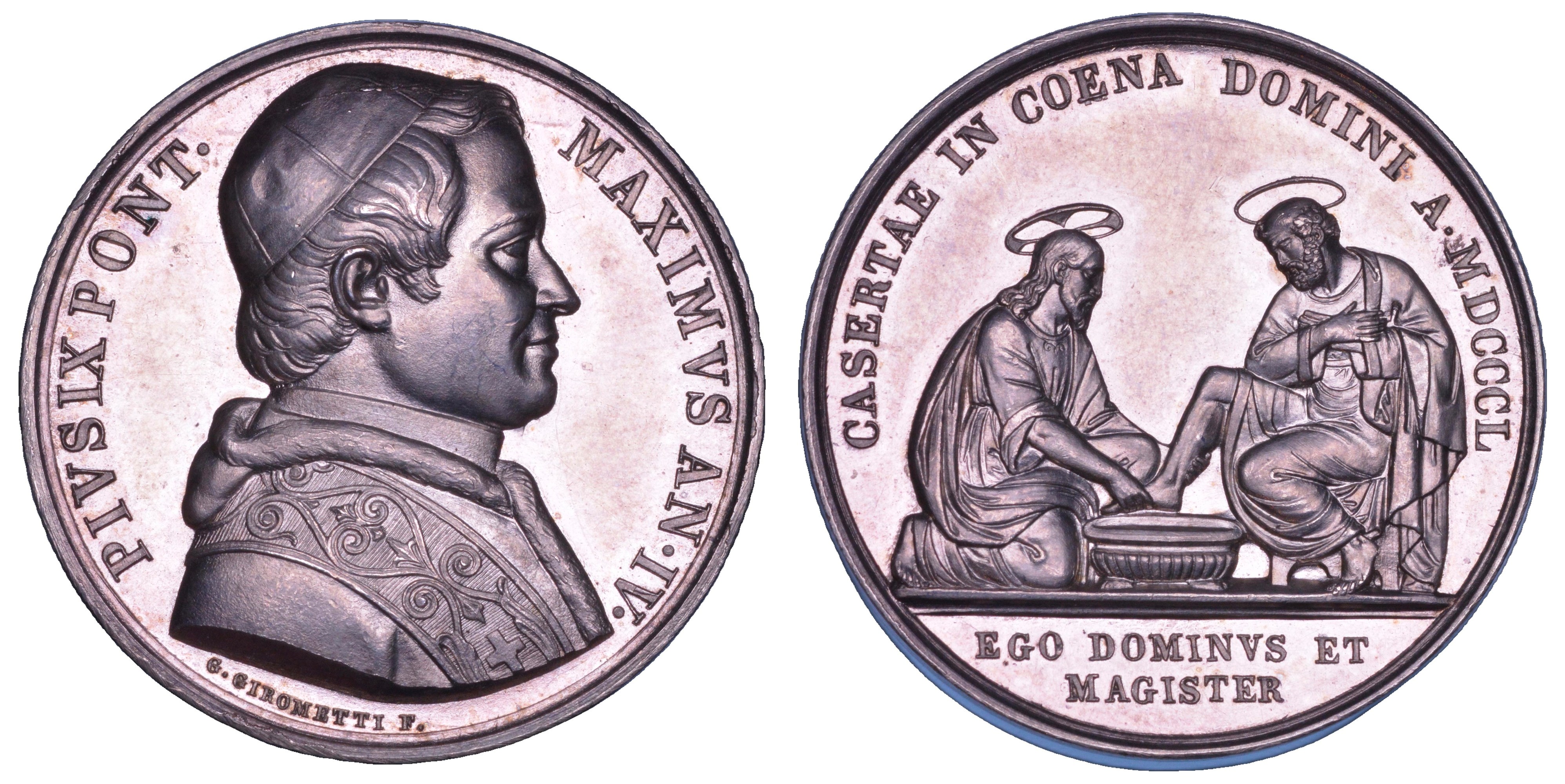 PIVS IX PONT MAXIMVS AN IV Busto del Pontefice a d. con zucchetto e piviale ornato. R/ CASERTAE IN COENA DOMINI A MDCCCL Gesù nimbato lava i piedi a S. Pietro in esergo, EGO DOMINVS ET MAGISTER. Opus Giuseppe Girometti. Bart. Pio IX IV-19. Molto rara. g. 15,75. Diam. mm. 32,47. Arg. q.FDC