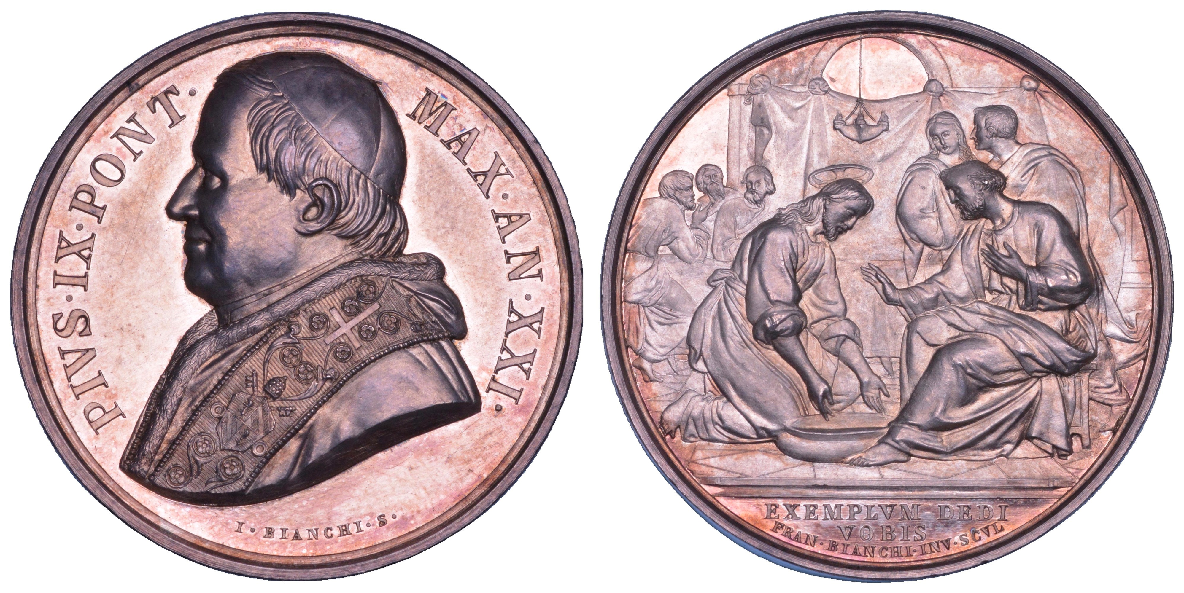 PIVS IX PONT MAX AN XXI Busto del Pontefice a s. con zucchetto e piviale ornato. R/ EXEMPLVM DEDI VOBIS Gesù nimbato lava i piedi a S. Pietro. Sullo sfondo, San Giuseppe, la Vergine e gli Apostoli. Opus Giuseppe e Francesco Bianchi. Bart. Pio IX XXI-10. Molto rara. g. 15,95. Diam. mm. 32,40. Arg. q.FDC
