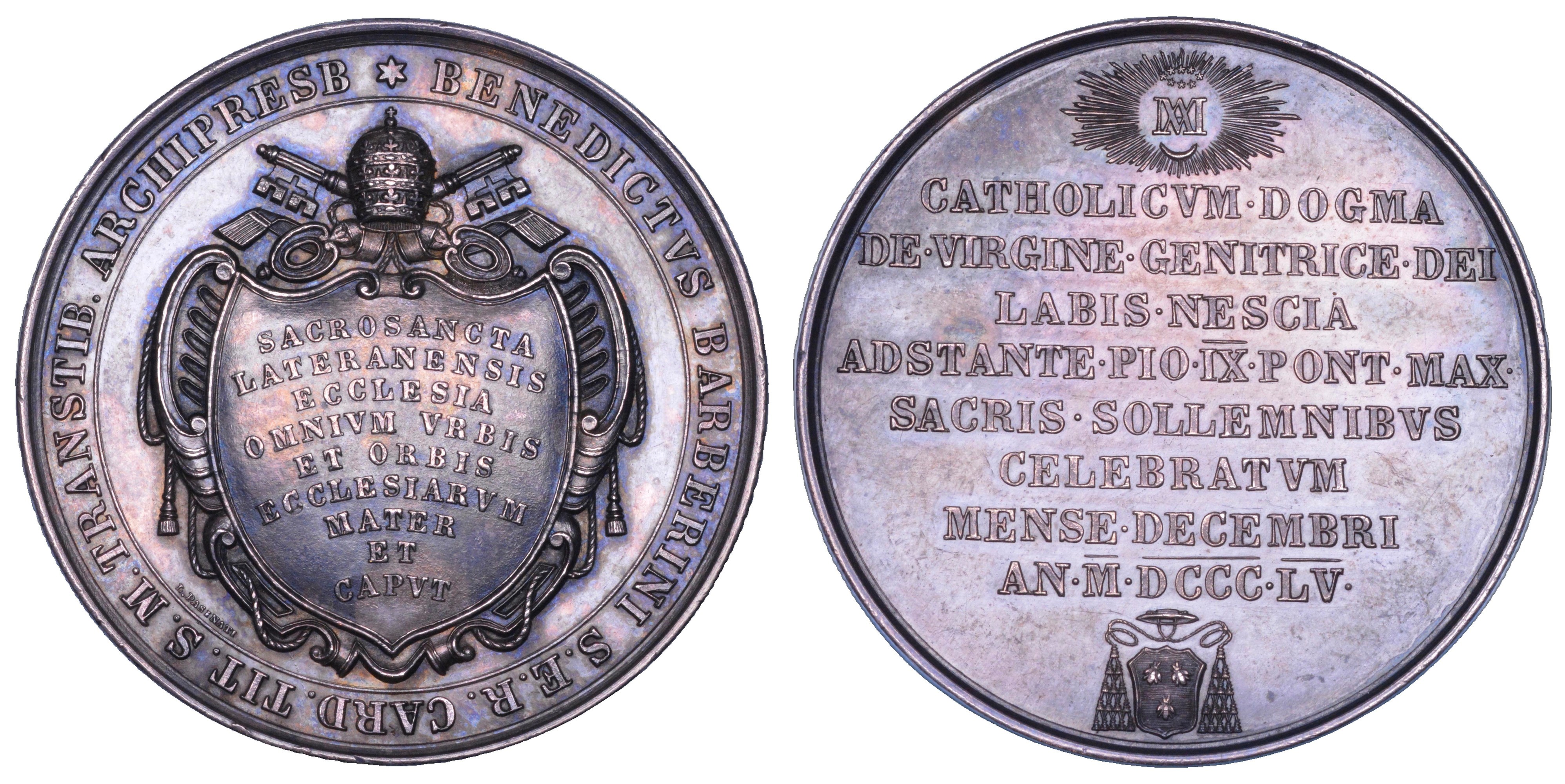 Nel giro BENEDICTVS BARBERINI S E R CARD TIT S M TRANSTIB ARCHIPRESB All'interno, stemma sormontato dal triregno e chiavi con la scritta SACROSANCTA LATERANENSIS ECCLESIA OMNIVM VRBIS ET ORBIS ECCLESIARVM MATER ET CAPVT su nove righe. R/ Sotto il monogramma raggiante di Maria CATHOLICVM DOGMA DE VIRGINE GENITRICE DEI LABIS NESCIA ADSTANTE PIO IX PONT MAX SACRIS SOLLEMNIBVS CELEBRATVM MENSE DECEMBRI AN M DCCC LV in otto righe; sotto, stemma Barberini. Opus anonimo. Bart. Pio IX, X-15. Rarissima. g. 29,58. Diam. mm. 43,60. Arg. SPL