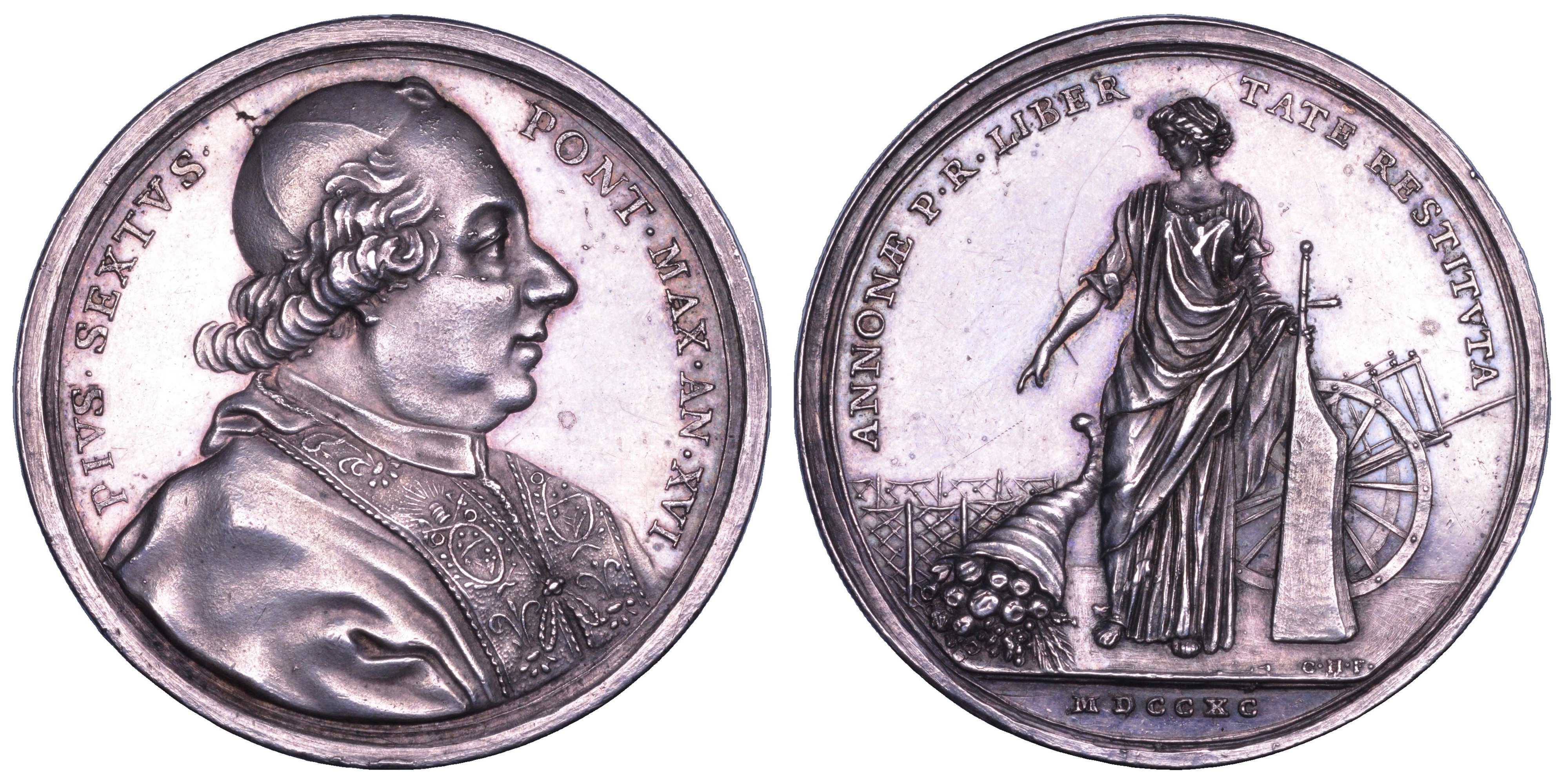 PIVS SEXTVS PONT MAX AN XVI Busto del Pontefice a d. con zucchetto, mozzetta e stola riccamente ornata. R/ ANNONAE P R LIBERTATE RESTITVTA L'Annona in piedi, con il timone in mano (simbolo di buona amministrazione) e a fianco una cornucopia con spighe e frutta; in esergo, MDCCXC. Bart. E790. Modesti 268. Patrignani 69a. Molto rara. g. 24,77. Diam. mm. 40,17. Arg. Lievi graffi. SPL