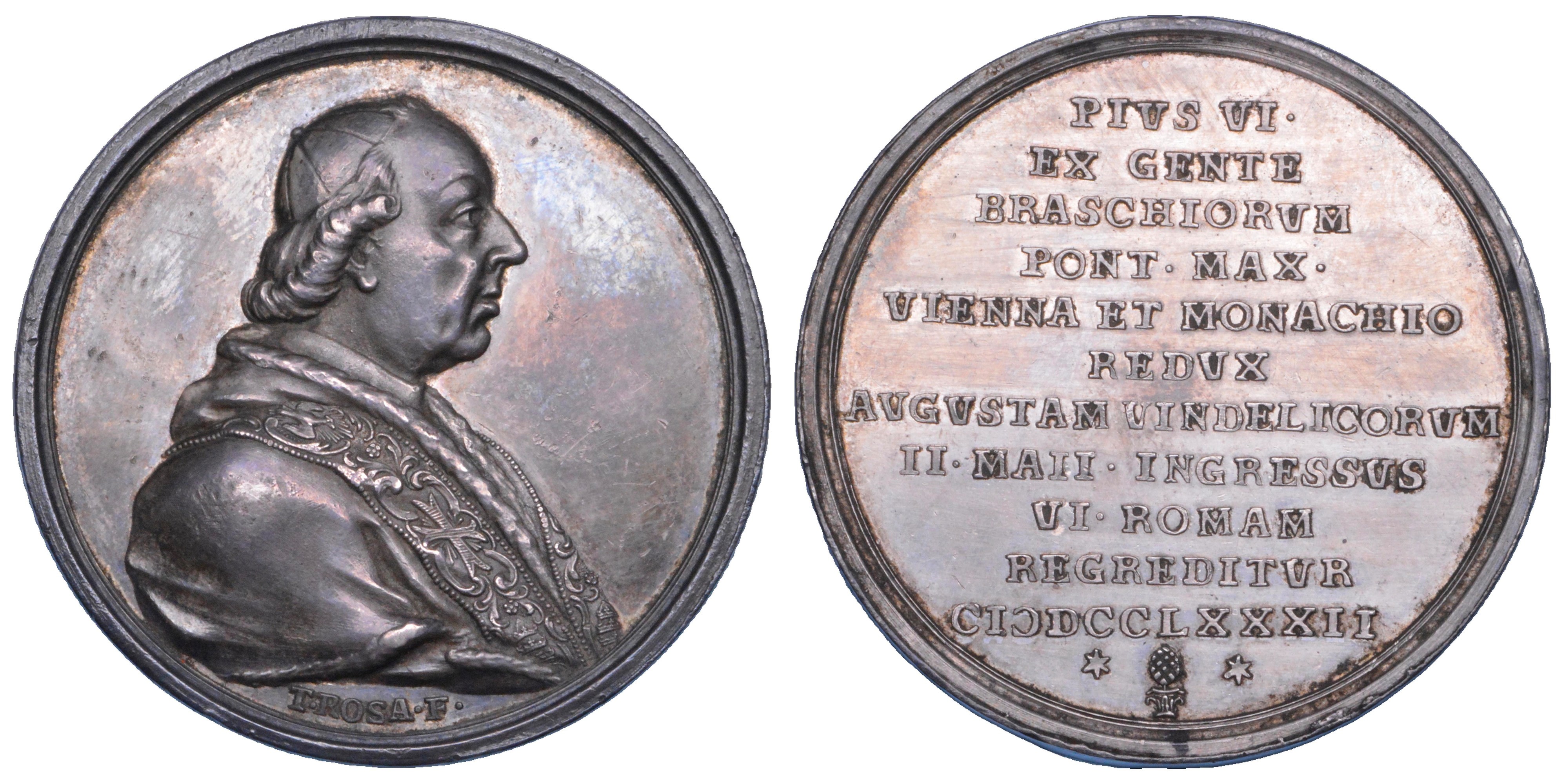 Busto del Pontefice a d. con zucchetto, mozzetta e stola ornata con croce; sotto il taglio della spalla, T ROSA F. R/ Scritta su undici righe, PIVS VI EX GENTE BRASCHIORVM PONT MAX VIENNA ET MONACHIO REDVX AVGVSTAM VINDELICORVM II MAII INGRESSVS VI ROMAM REGREDITVR MDCCLXXXII. Opus T. Rosa. Patrignani p. 151, 42b. g. 36,81. Diam. mm. 41,66. Arg. Lievi segni di contatto. q.SPL