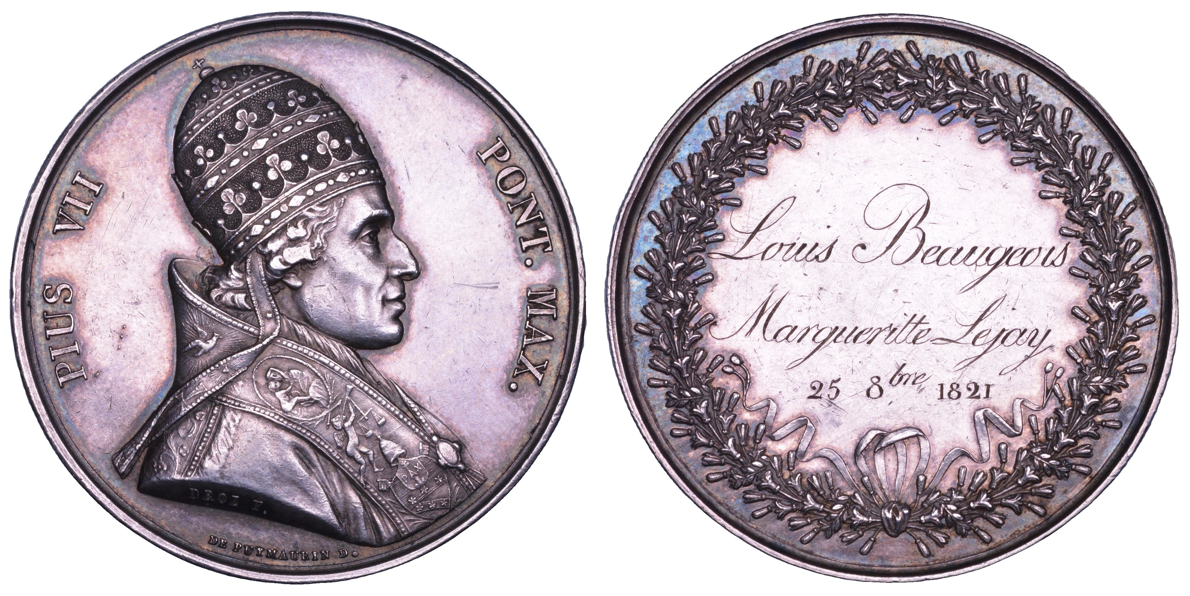 PIVS VII PONT MAX Busto del Pontefice a d. con triregno. R/ Incisione LOUIS BEAUGEOIS MARGUERITTE LEJAJ 25 8bre 1821. Entro corona di alloro. Opus Jean Pierre Broz (diritto). Bertuzzi, tipo 150. g. 29,50. Diam. mm. 40,86. Estremamente rara. BB/q.SPL