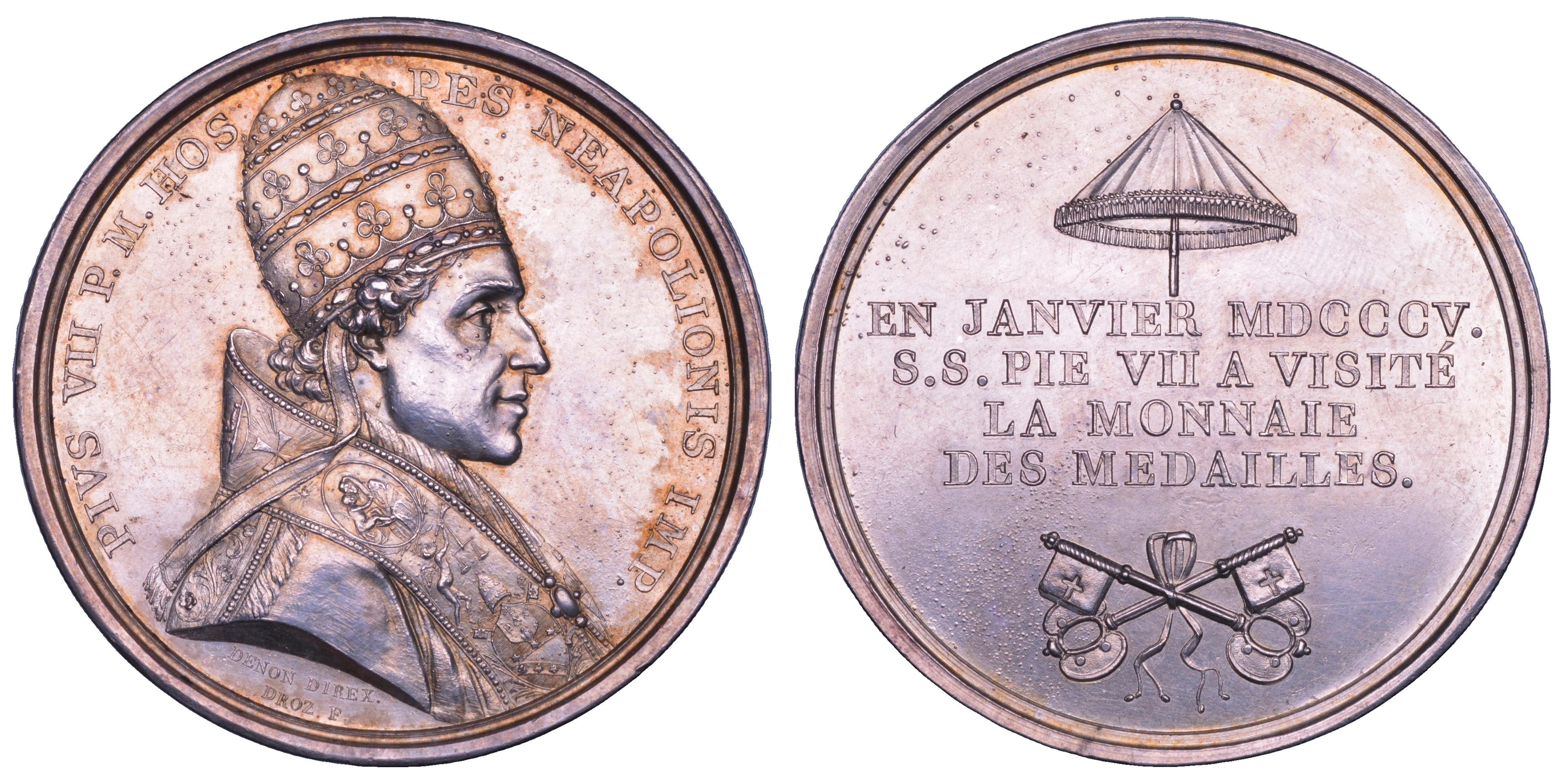 STATO PONTIFICIO. PIO VII (Barnaba Chiaramonti), 1800-1823. Medaglia in argento 1805/(A. IV). Visita del Pontefice alla zecca di Parigi.