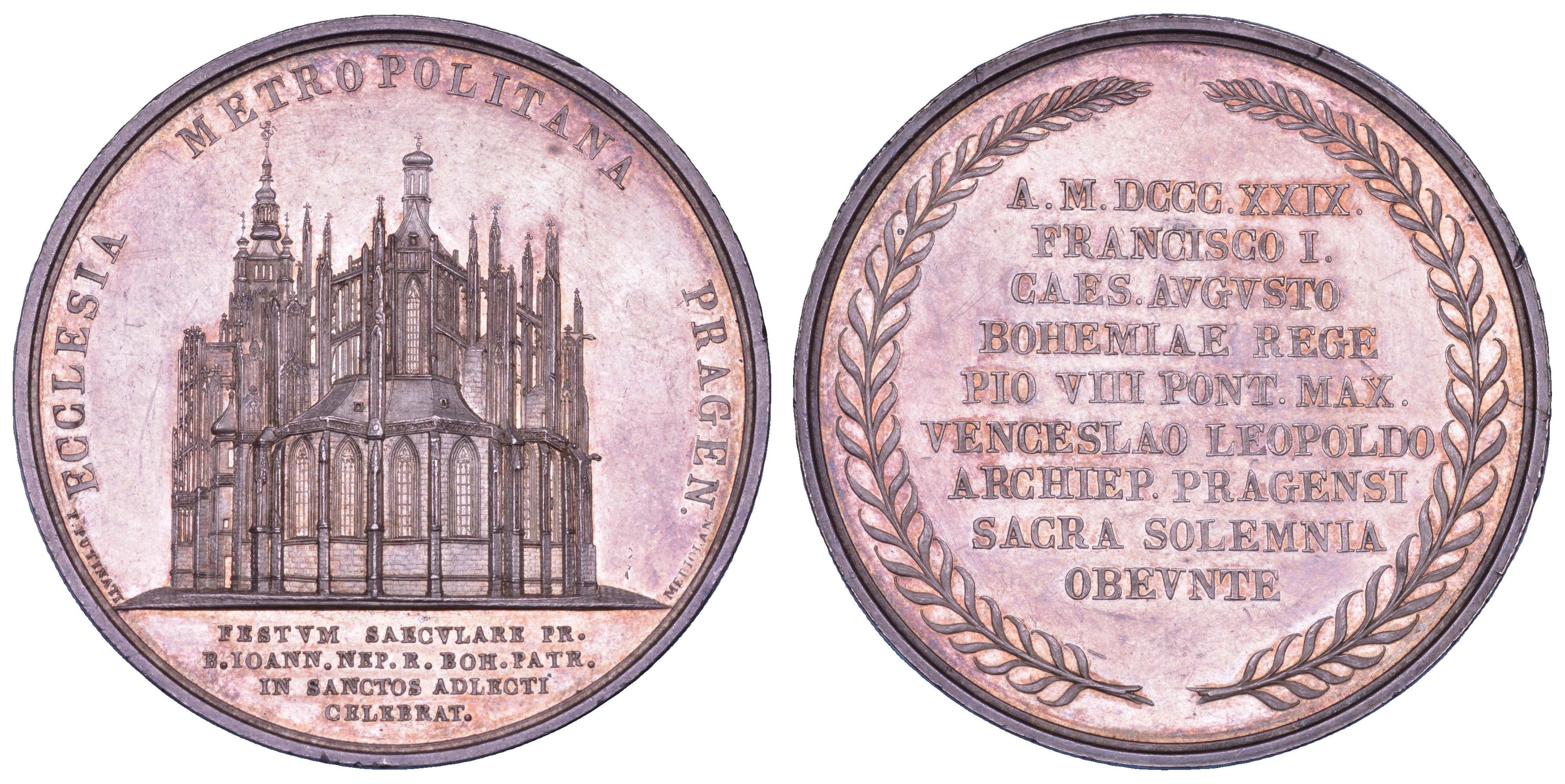 ECCLESIA METROPOLITANA PRAGEN. Cattedrale di San Vito a Praga; in esergo, FESTVM SAECVLARE PR S IOANN NEP R BOH PATR IN SANCTOS ADLECTI CELEBRAT. R/ A M DCCC XXIX FRANCISCO I CAES AVGVSTO BOHEMIAE REGE PIO VIII PONT MAX VENCESLAVO LEPOLDO ARCHIEP PRAGENSI SACRA SOLEMNIA OBEVNTE. Iscrizione disposta su 9 righe; entro due rami di palma. Opus F. Putinati. Bertuzzi 1, Patrignani 1 bis. Molto Rara. g. 62,80. Diam. mm. 49,44. Arg. SPL/FDC