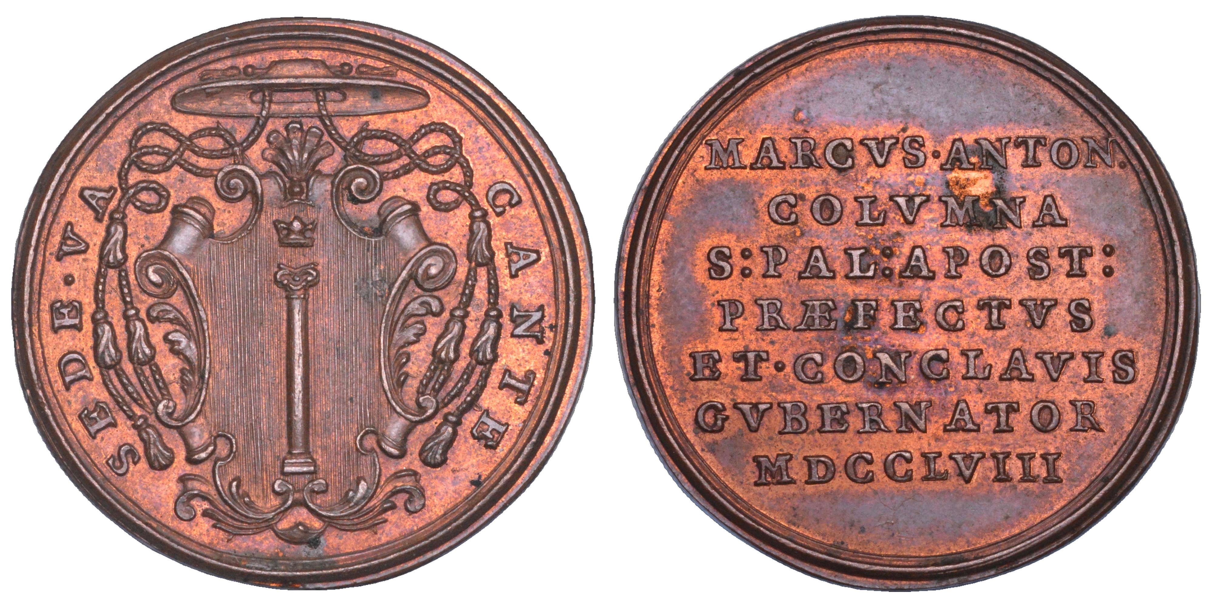 Stemma del Monsignore Marco Antonio Colonna. R/ MARCVS ANTON COLVMNA S PAL APOST PRAEFECTVS ET CONCLAVIS GVBERNATOR MDCCLVIII su sette righe. Opus O. Hamerani. Boccia 59. Bartolotti p. 176. Patrignani 79. Estremamente rara, coniati solo 54 esemplari in bronzo. g. 8,06. Diam. mm. 27,60. Bronzo. q.FDC
