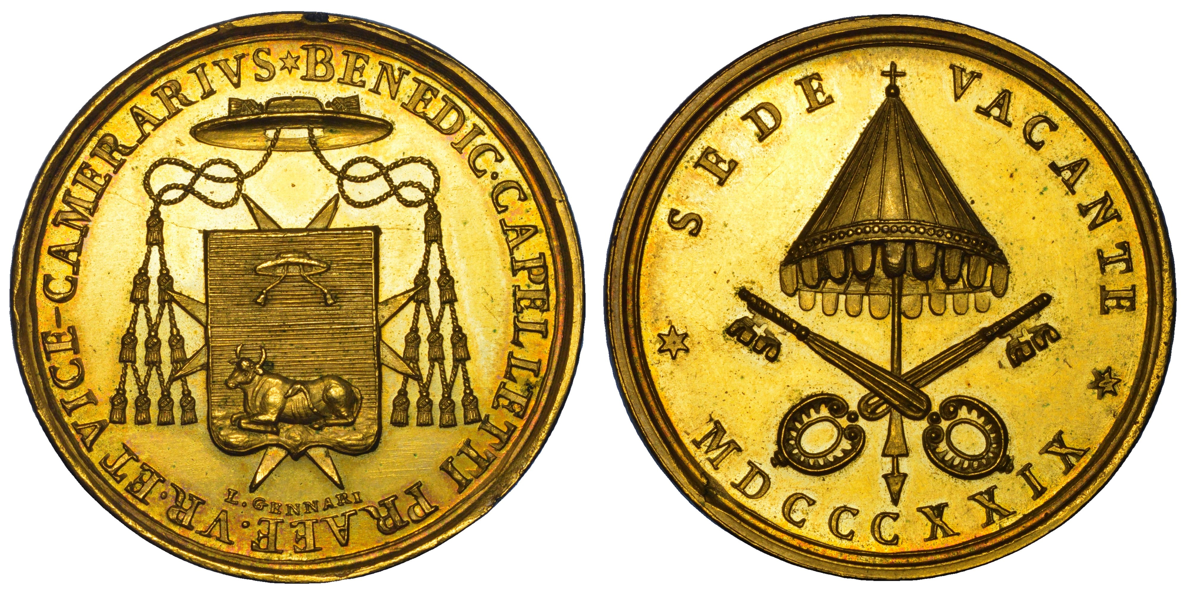 BENEDIC CAPELLETTI PRAEF VR ET VICE CAMERARIVS Stemma di Monsignor Cappelletti sovrapposto ad una Croce di Malta. R/ SEDE VACANTE MDCCCXXIX Padiglione e chiavi decussate. Opus Luigi Gennari. Boccia 87. Calò 34. Bartolotti p. 248. Patrignani 122. Rara. g. 23,39. Diam. mm. 36,93. Bronzo dorato. Segni di contatto sui bordi. SPL