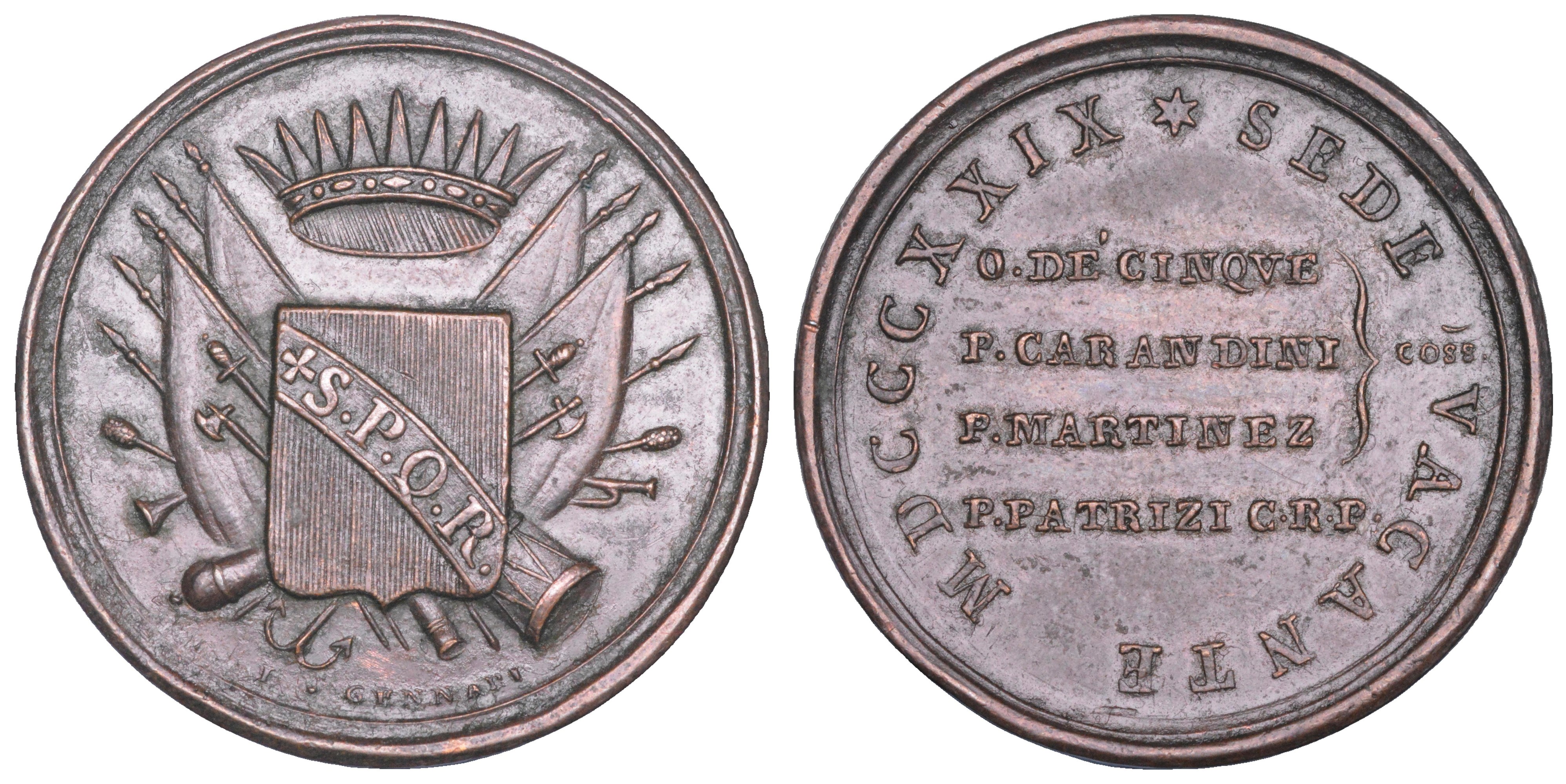 Stemma della Città di Roma con all'interno la scritta S P Q R e sovrapposto a bandiere ed emblemi militari. R/ Nel giro, SEDE VACANTE MDCCCXXIX All'interno, O DE' CINQUE P CARANDINI P MARTINEZ P PATRIZI CRP su quattro righe, di cui le prime tre tra parentesi graffa. Opus L. Gennari. Boccia 90. Bartolotti p. 248. Patrignani 138. Rara. g. 18,84. Diam. mm. 32,92. Bronzo. BB/q.SPL