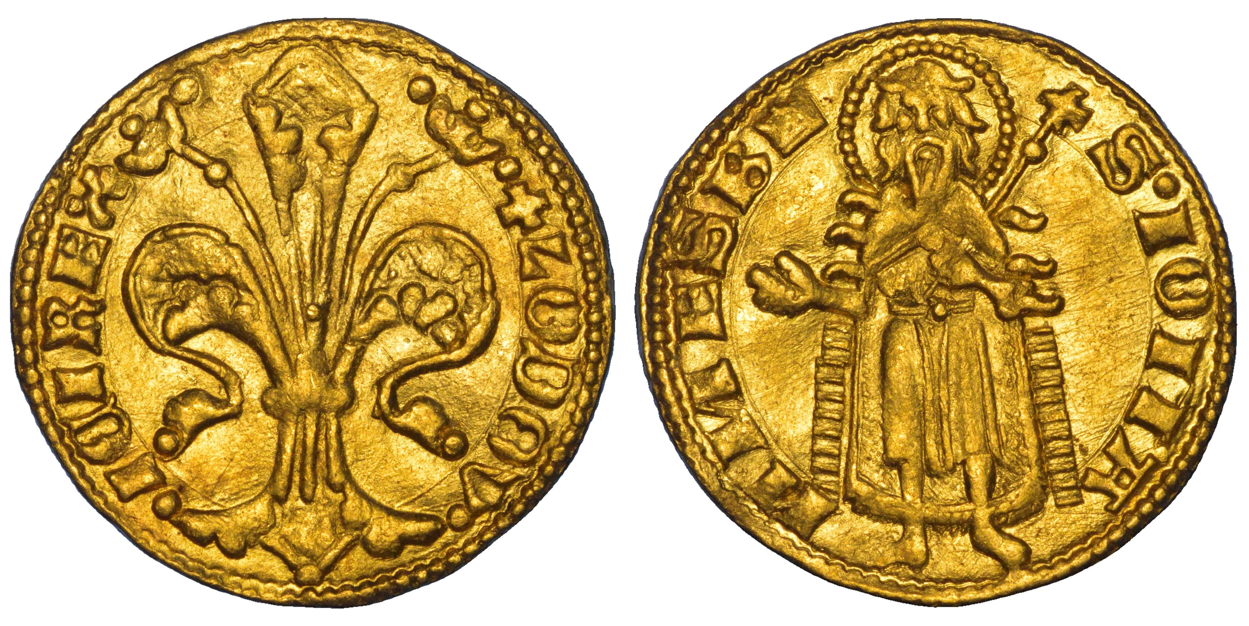 Giglio fiorentino. R/ San Giovanni Battista in piedi, benedicente con la mano d. e regge una croce con la s. Corona in alto a s. Friedb. 3. Pohl B 1. Huszár 512. g. 3,52. Diam. mm. 21,33. Oro. SPL