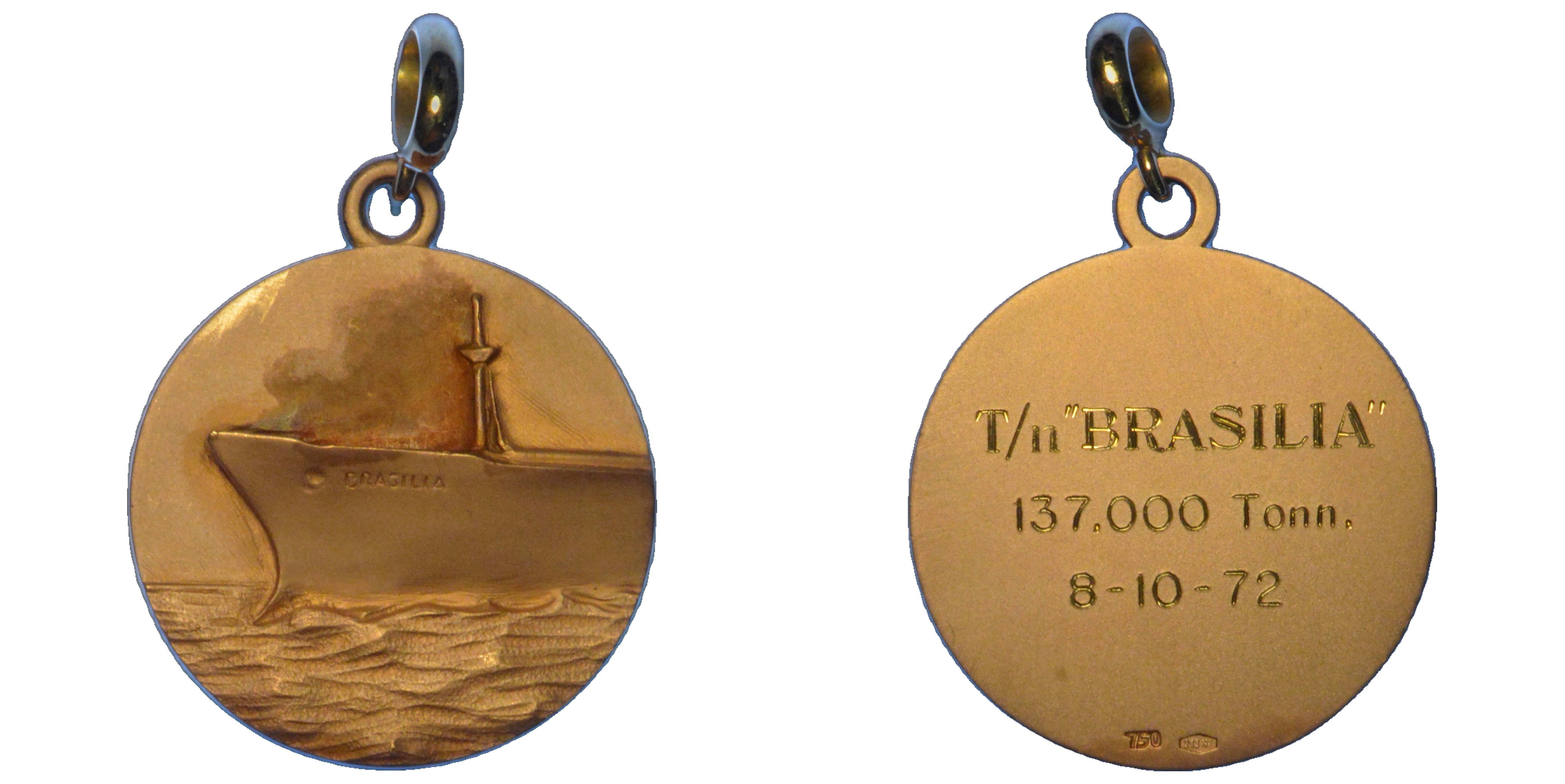 Prua del piroscafo verso s. R/ Legenda e data in tre righe. g. 17,80. Diam. mm. 29,84 (escluso anello). Oro (titolo 750). SPL/q.FDC