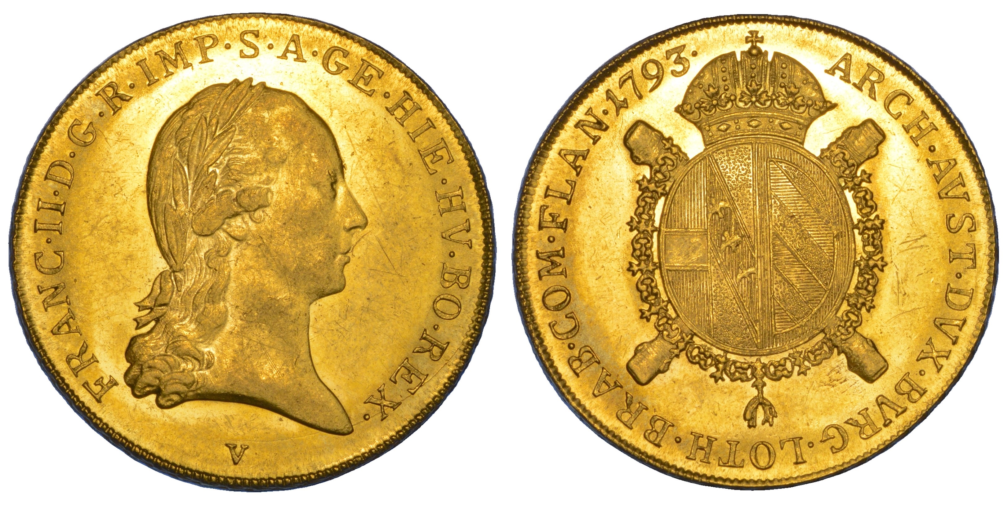 Testa laureata a d. R/ Stemma coronato, caricato su croce di Borgogna, circondato dal collare del Toson d'oro. Paolucci 1019. Gig. 2. Mont. 147. Raro. g. 11,07. Diam. mm. 28,55. Oro. Lievi graffi. q.FDC