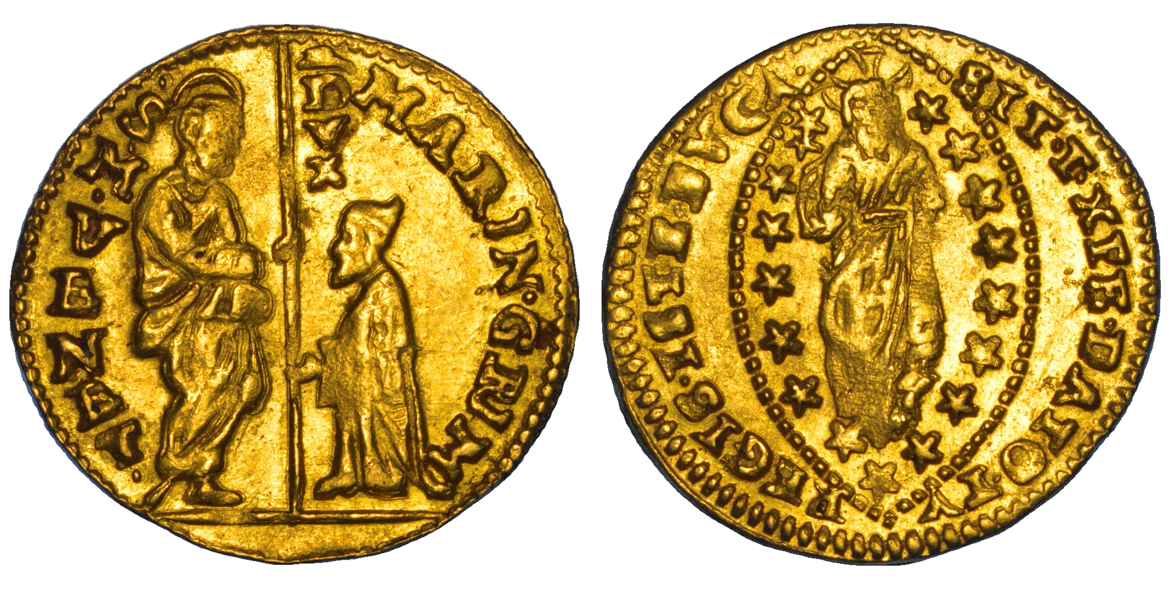 S. Marco, in piedi, porge il vessillo al doge genuflesso. R/ Il Redentore in piedi in aureola ellittica. Paol. 1. g. 3,47. Diam. mm. 20,67. Oro. BB