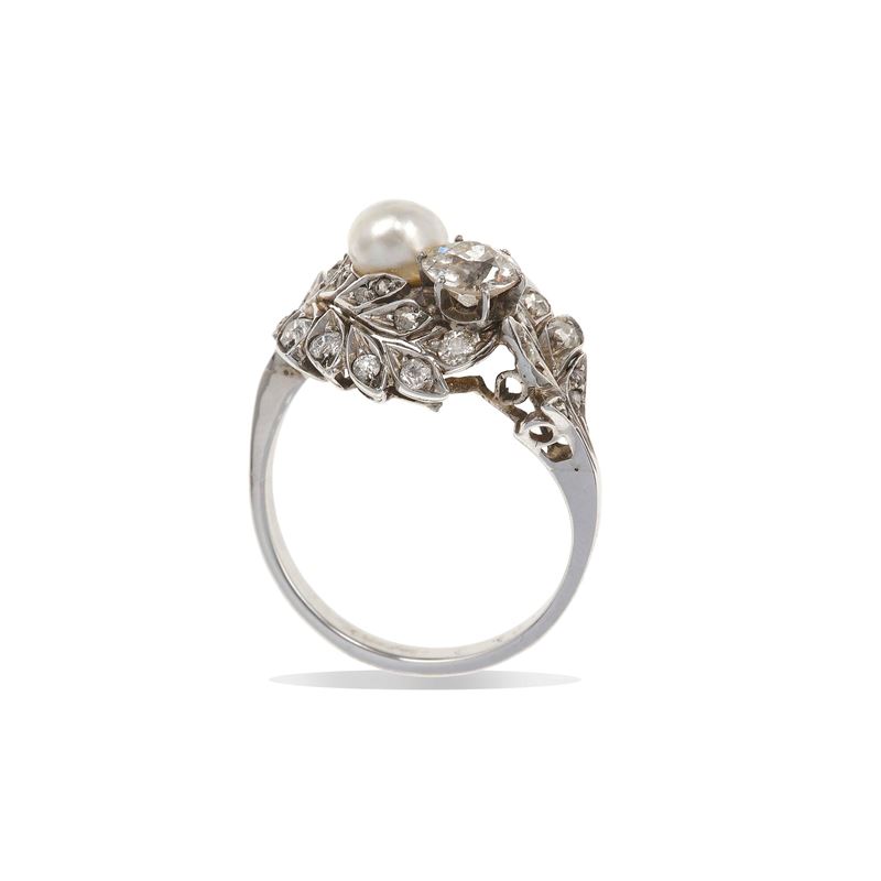 Cultured pearl, old-cut diamond and gold ring