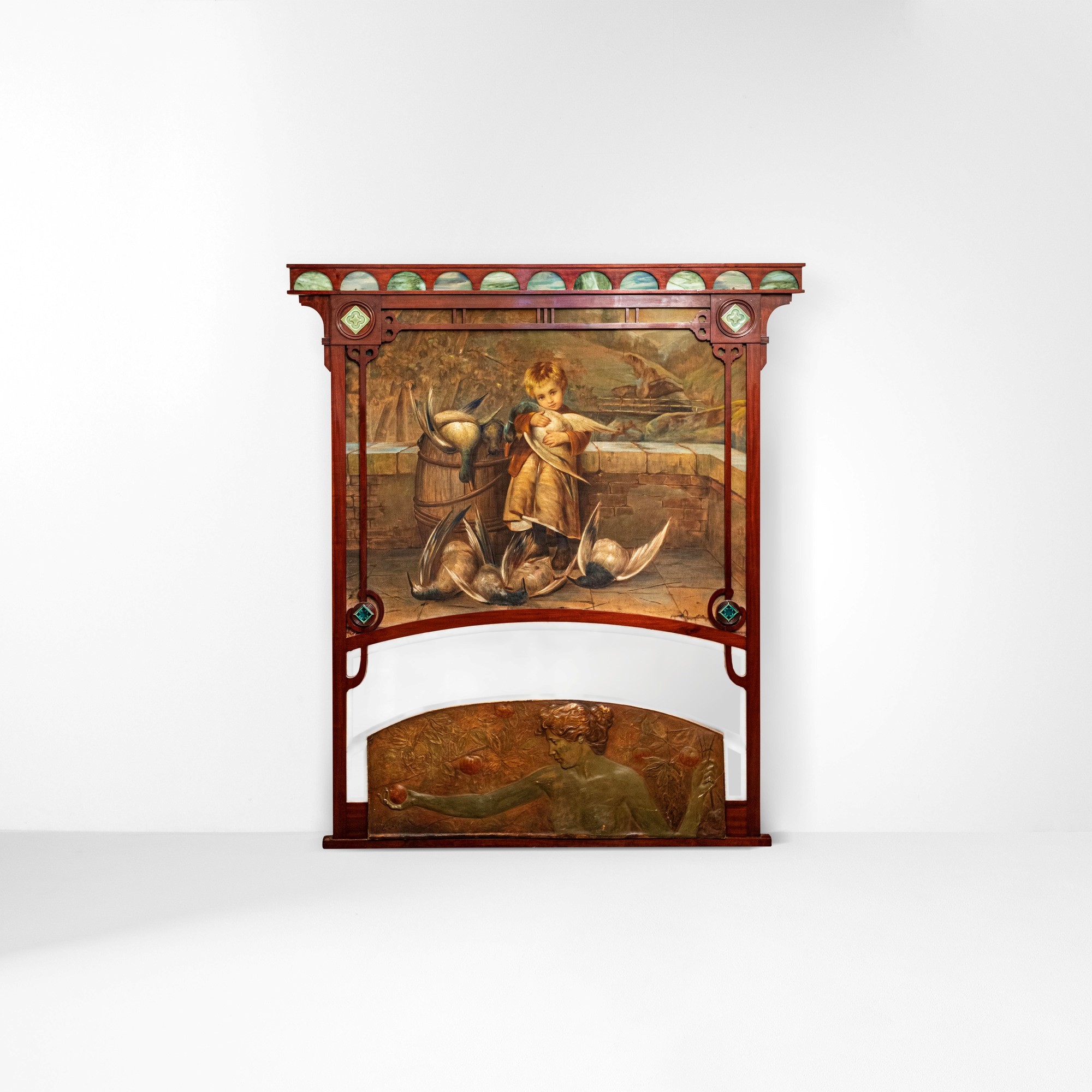 Struttura in legno e legno impiallacciato a decoro di arazzo, dettagli in pietra dura e ceramica smaltata. Basso rilievo in gesso patinato.