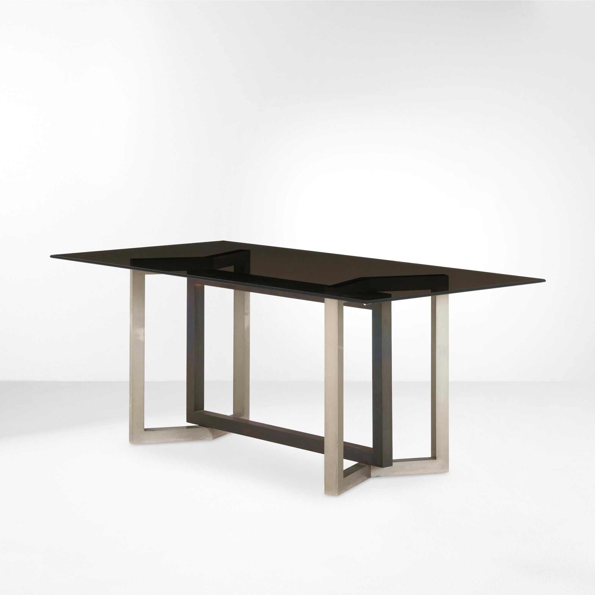 Struttura e sostegni in acciaio con piano in vetro fumé.