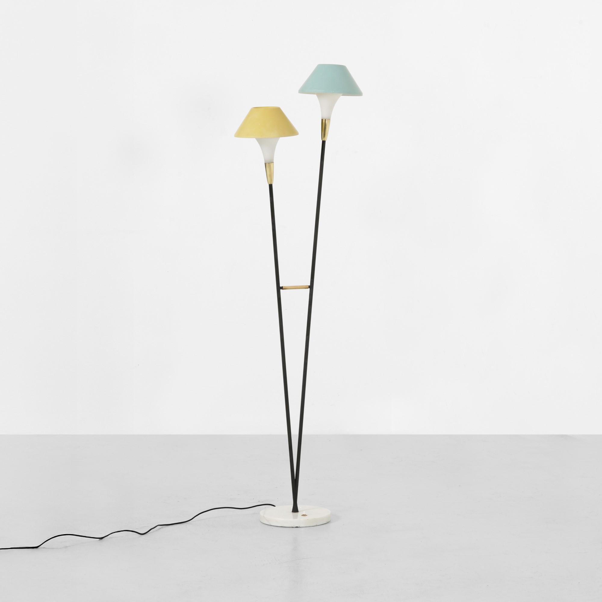 Struttura in metallo laccato, dettagli in ottone e base in marmo. Paralume in metallo laccato e diffusore in vetro opalino.