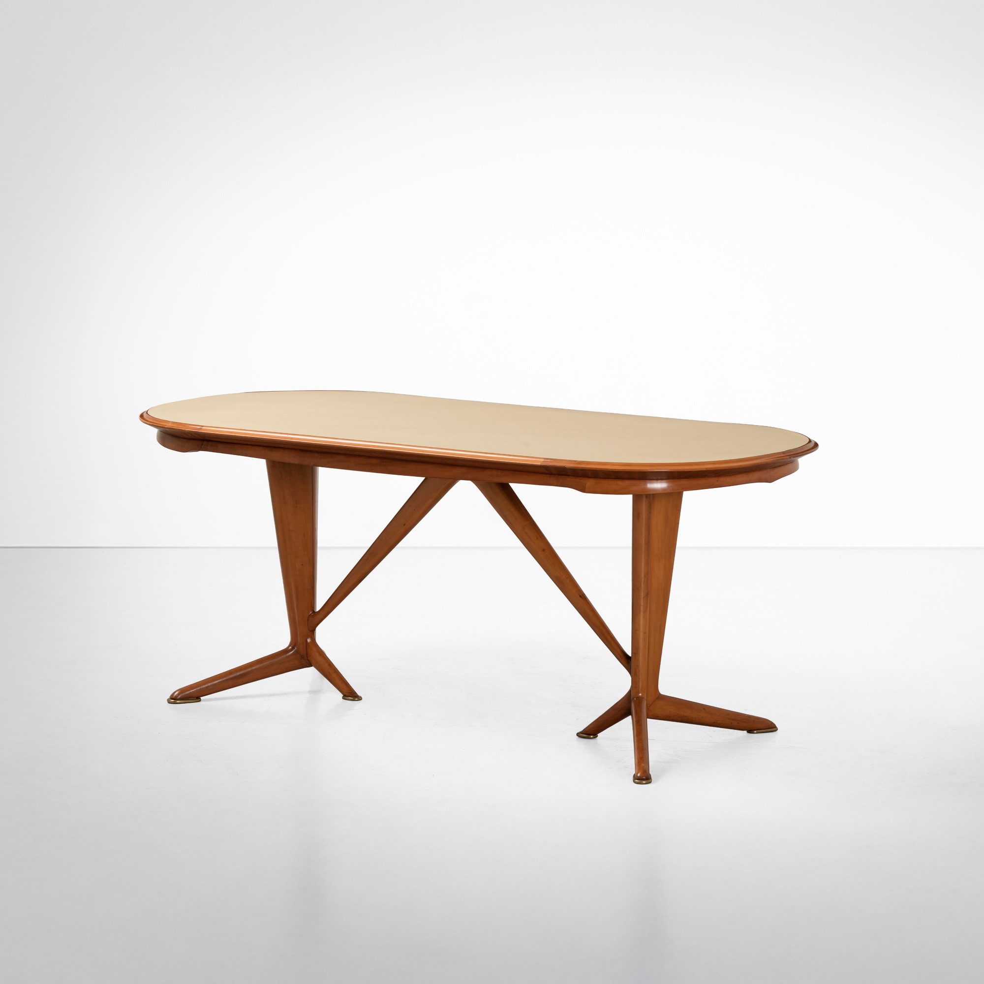 Struttura e sostegni in legno con piano in laminato e piedini in ottone.