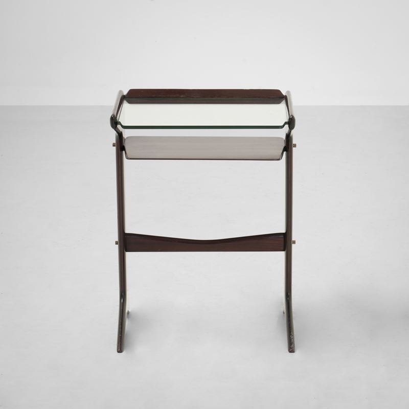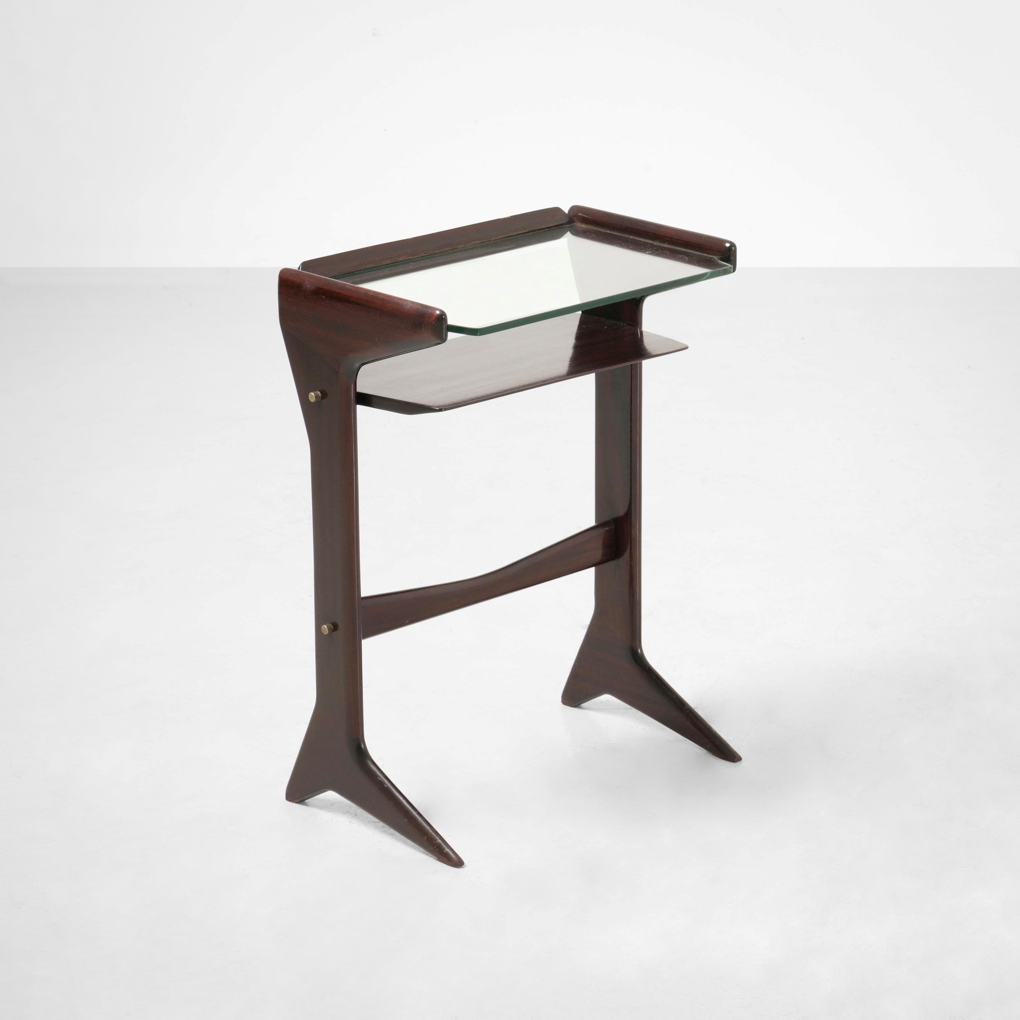 Struttura e sostegni in legno, dettagli in ottone e piano in cristallo molato.