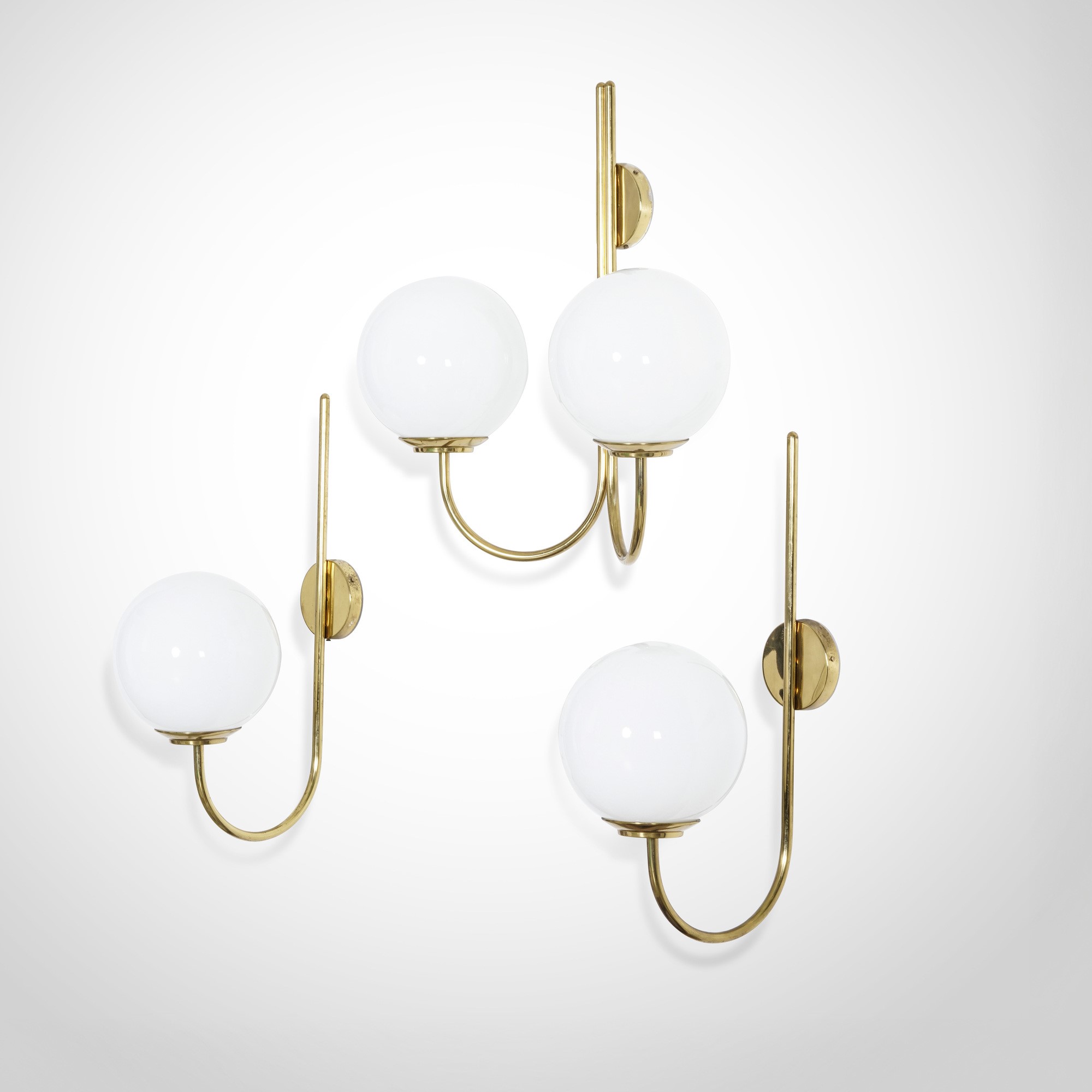 Struttura in ottone e diffusori in vetro opalino.