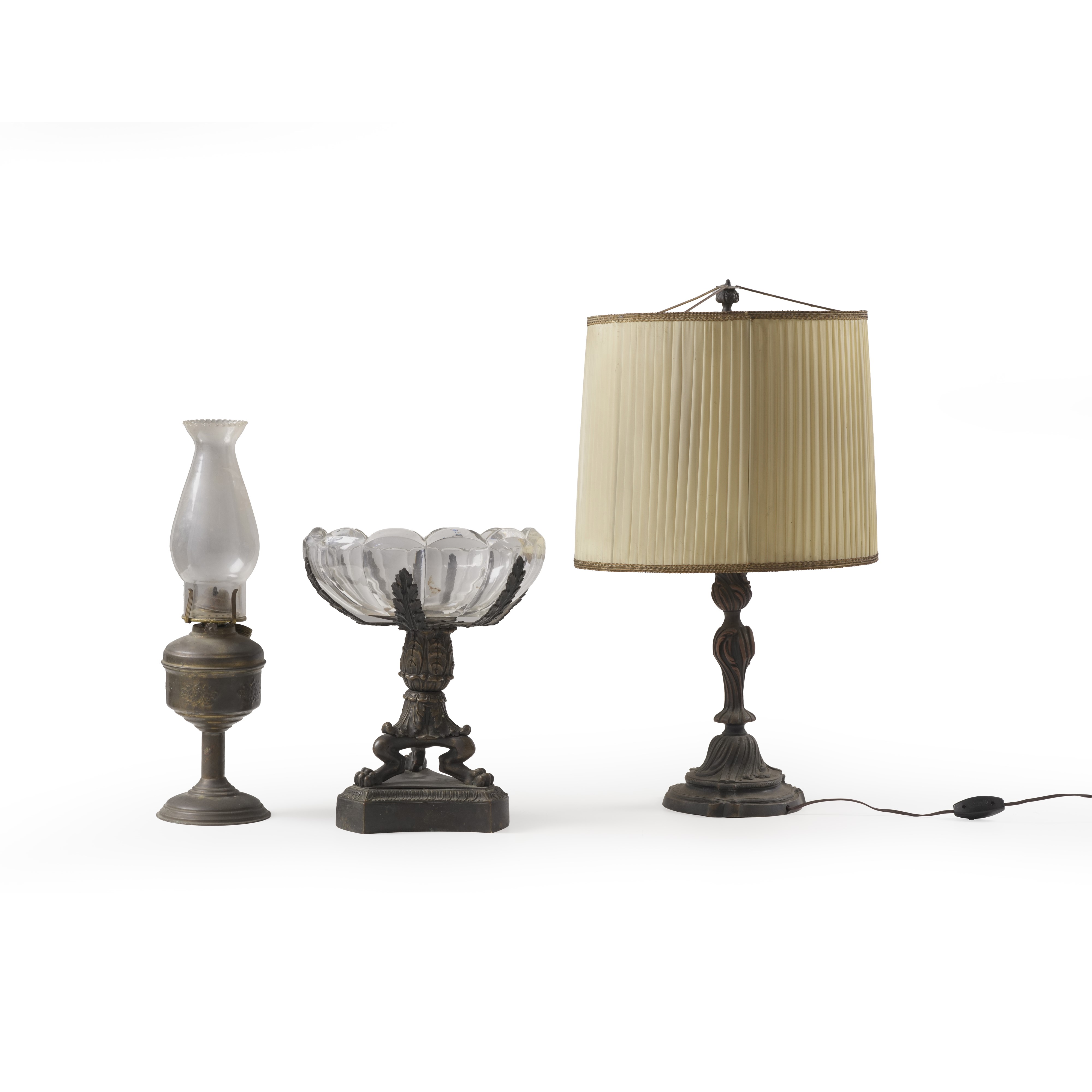 Un lampada a olio con paralume in vetro, centrotavola con coppa in vetro a fiore, tripode con piedi ferini, lampada adattata ad abat jour con decoro rocaille; tracce di doratura