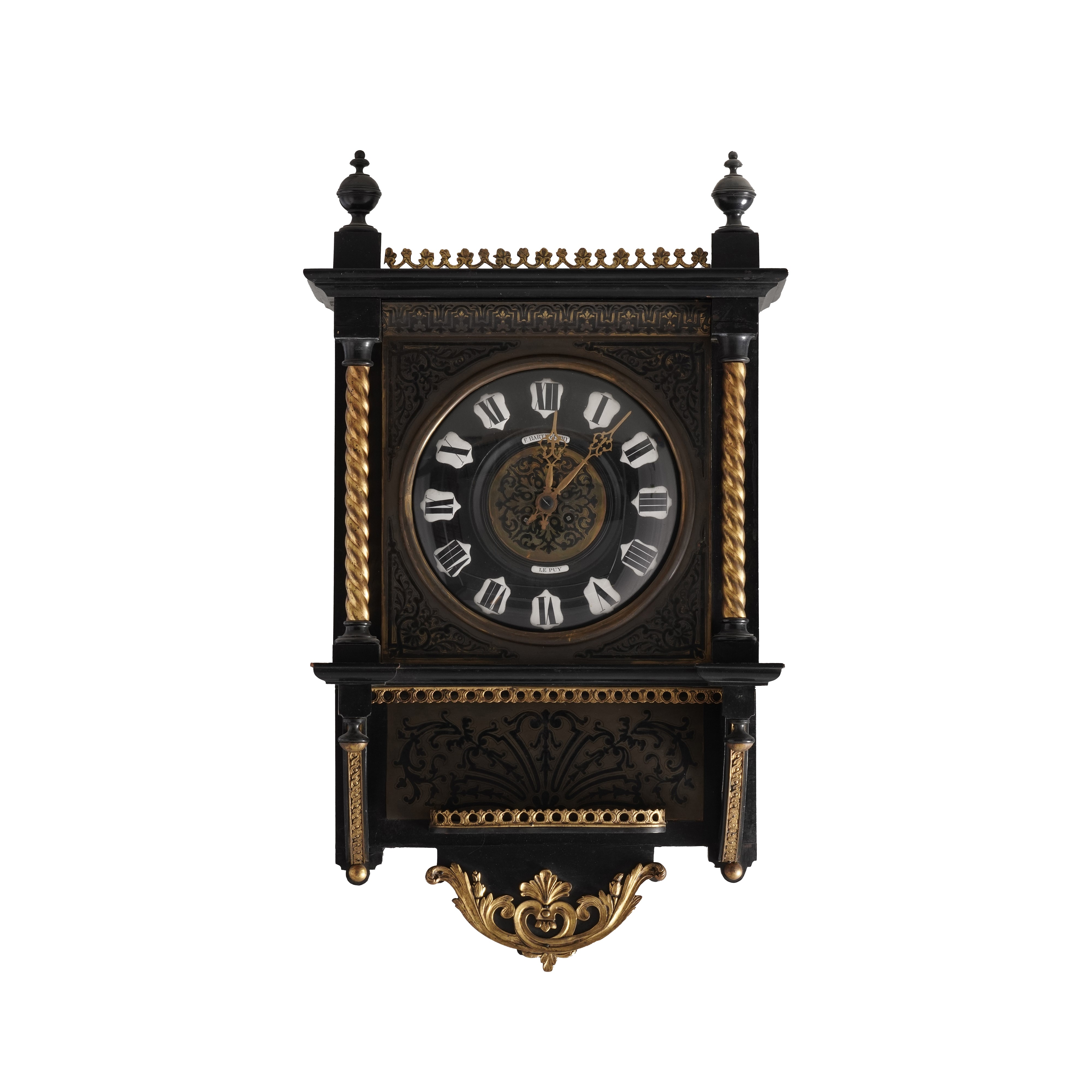Ricco decoro fitomorfo con intarsi in bronzo, montanti dorati torchon, quadrante con numeri romani. firma "F. Barthelemy / Le Puy"