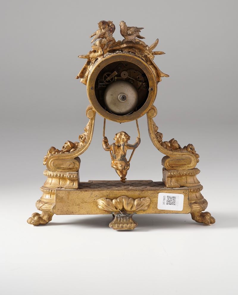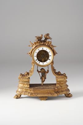 quadrante smaltato a numerazione romana per le ore; pendolo a guisa di Cupido su altalena