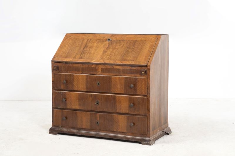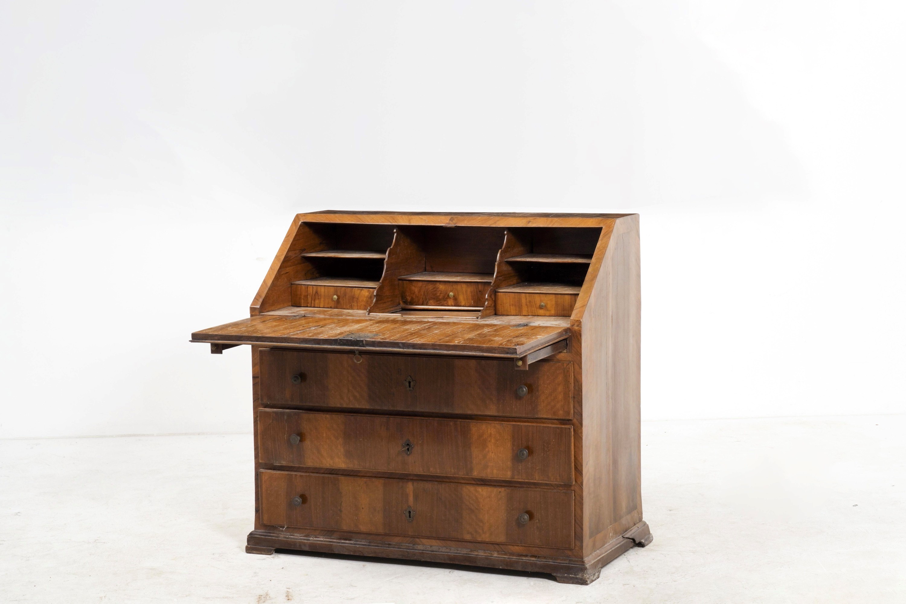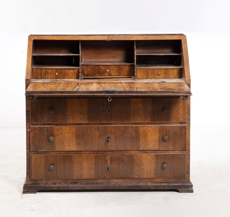 Fronte a tre cassetti sormontati da ribalta che cela scarabattolo con cassettini e scomparti