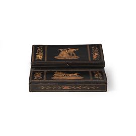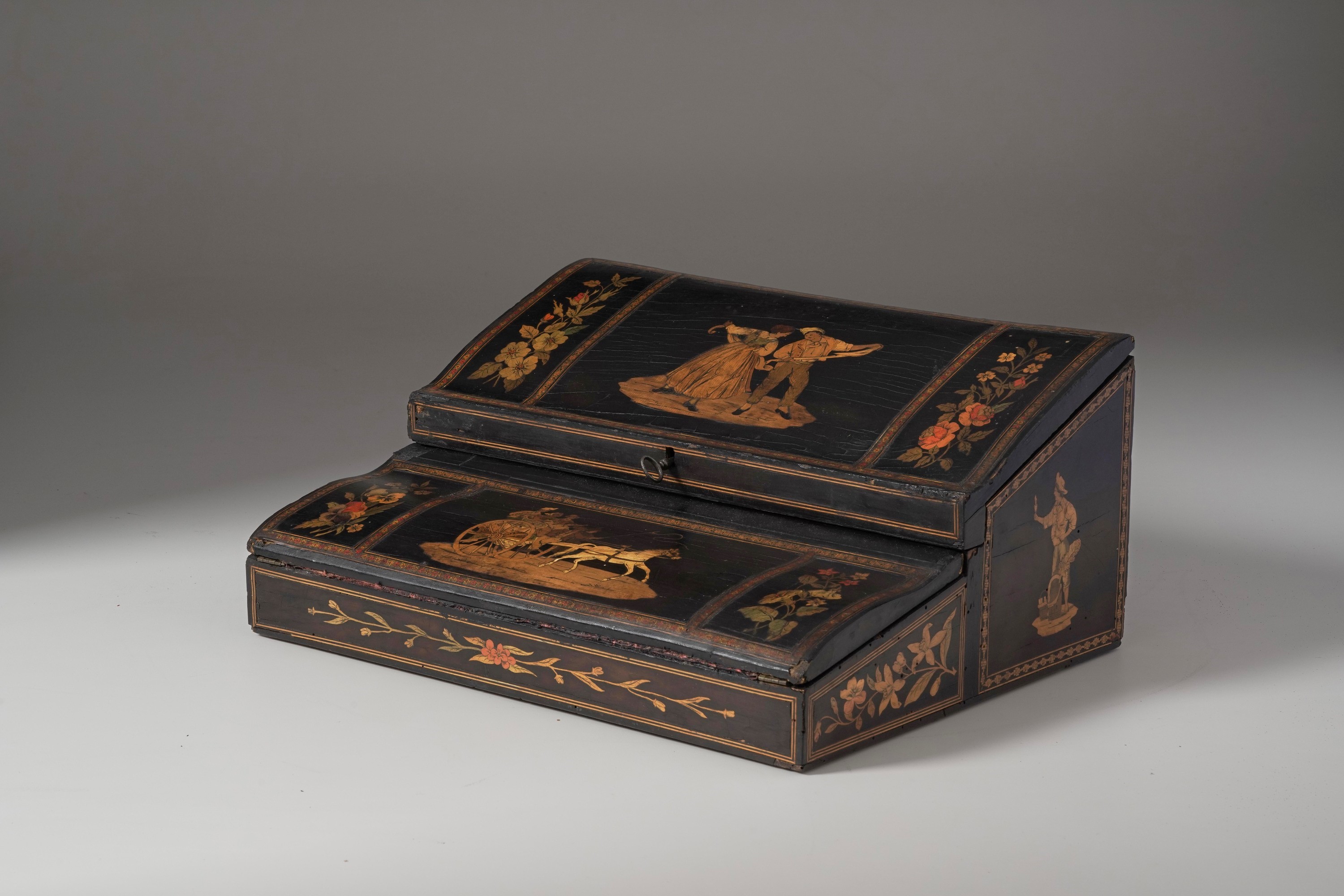 Decori con scene pittoresche e motivi fitomorfi, coperchio incernierato con cela scomparti e piano di scrittura foderato in tessuto