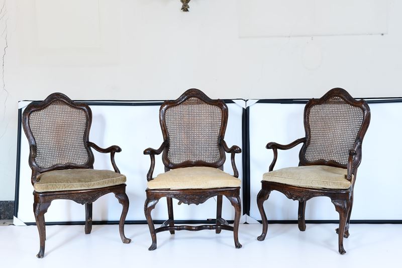 Six walnut armchairs, Veneto, early 1700s